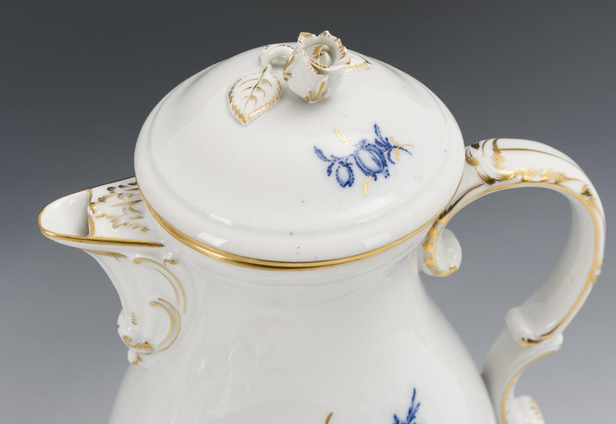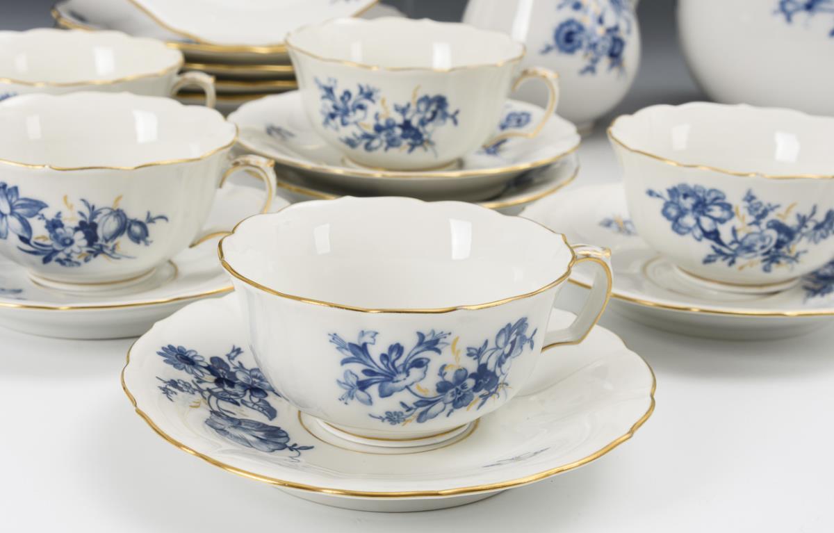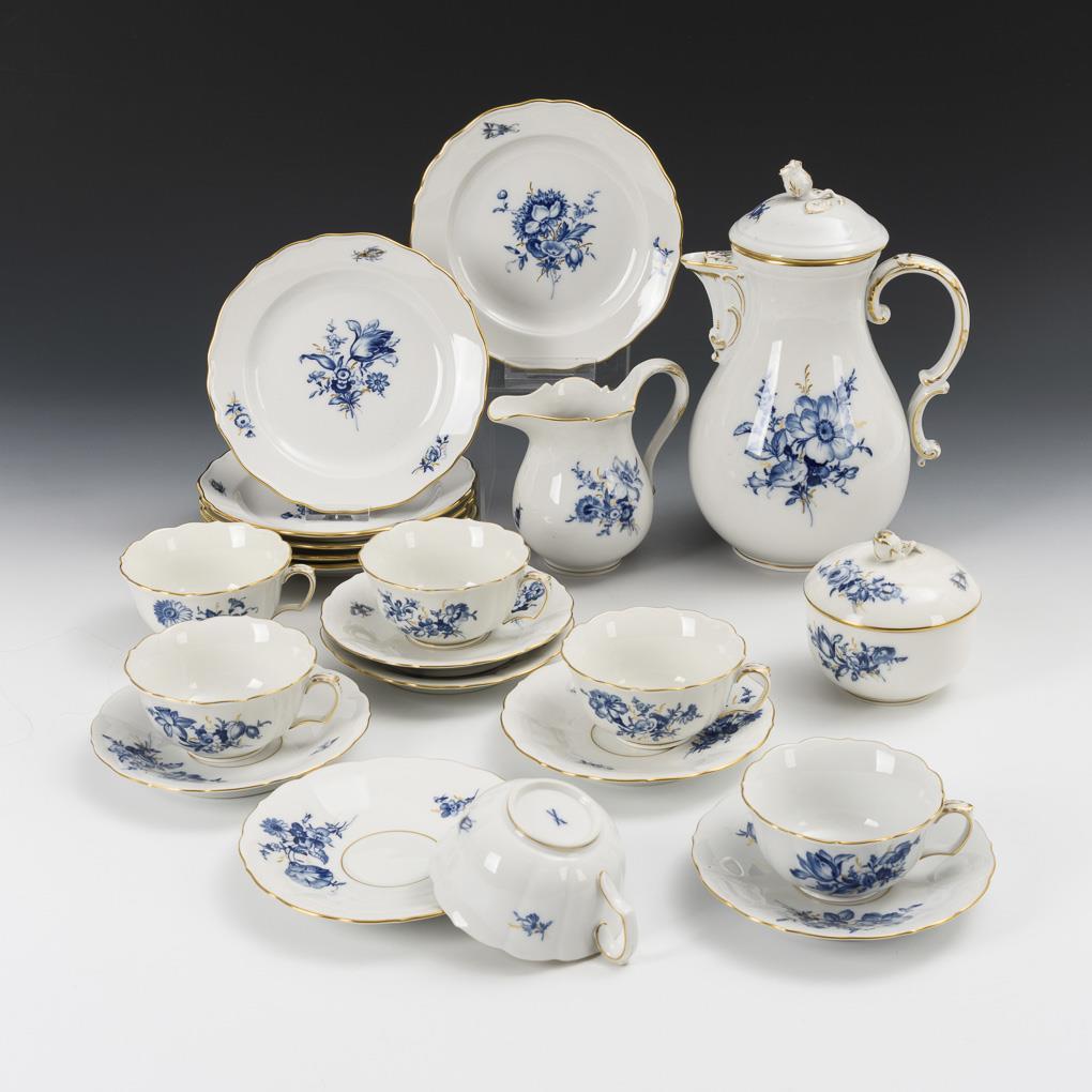 21 pieces. Form "New cutout". Coffee pot (h 26 cm), creamer, sugar bowl, 6 cups, 6 saucers and 6 breakfast plates. Rosom of the jug lid bumped.