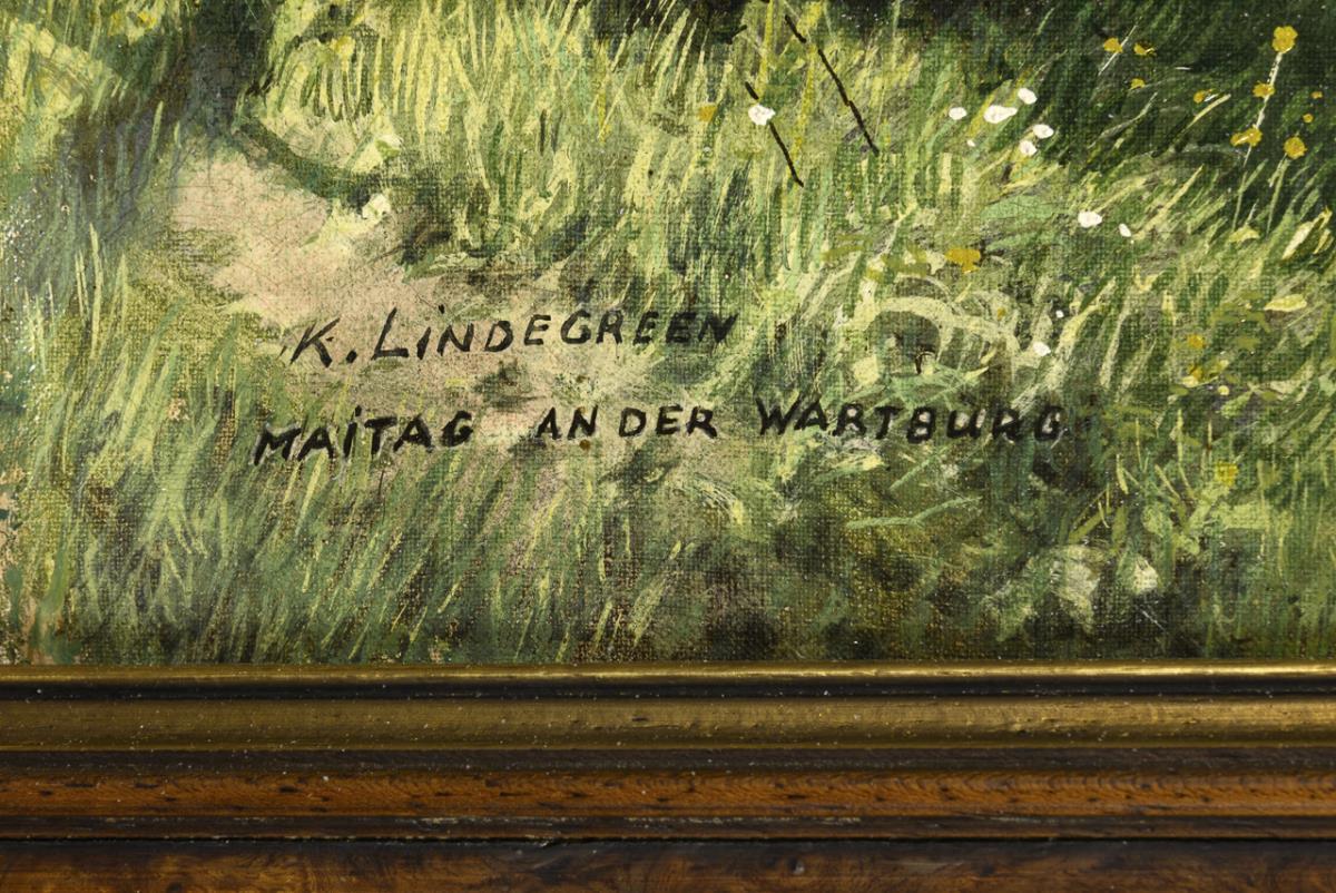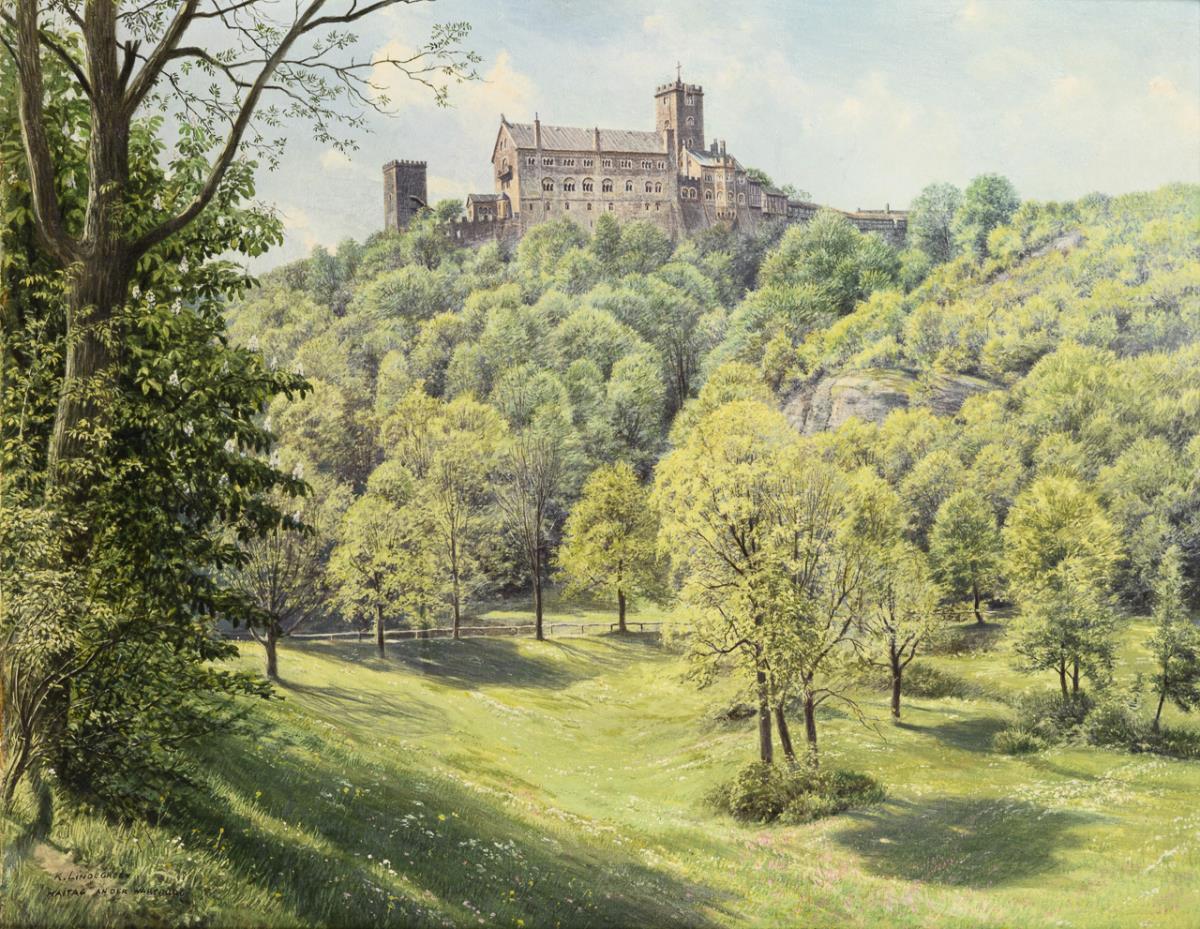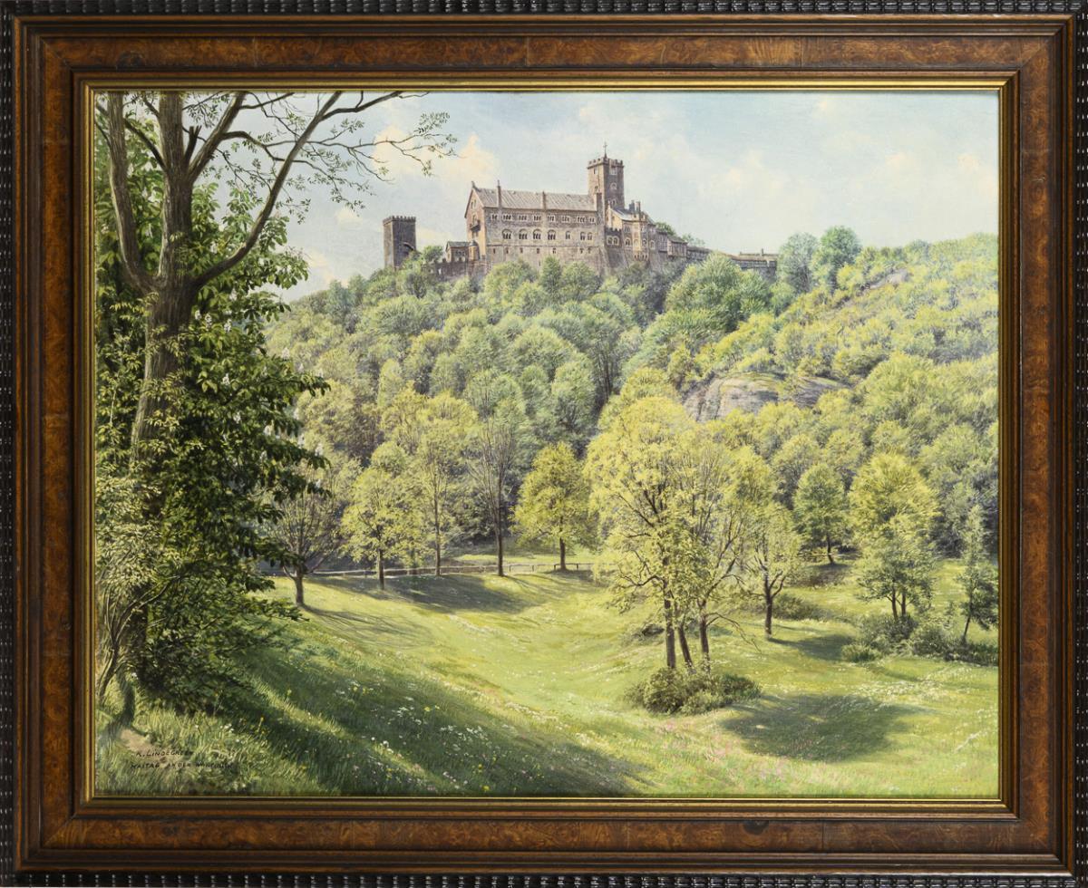 Blooming meadows in spring in front of the medieval castle on the mountain in the sunshine. Minimal signs of age.