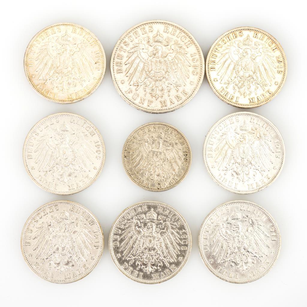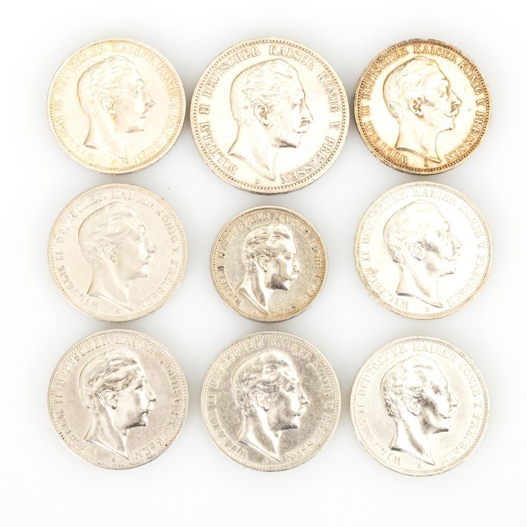 3 Mark, Deutsches Reich, Preußen von 1908: 2x 1909, 1910, 1911, 2x 1912. / 5 Mark 1898 / 2 Mark 1903. Alle "Wilhelm II. Deutscher Kaiser König v. Preussen". Zustand: ss.