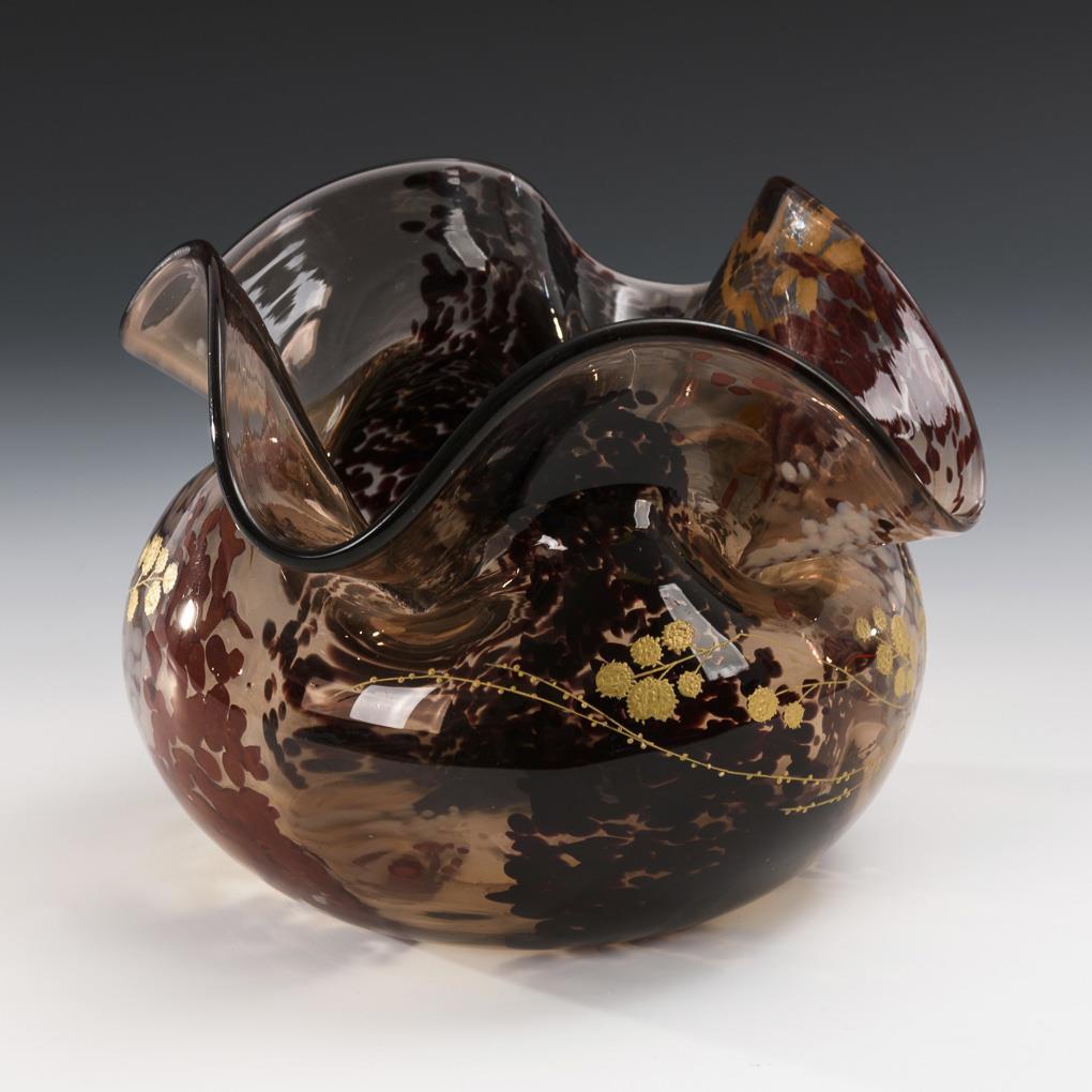 Smoke-colored glass with opaque red and opaque white coronal enamels in the intermediate layer; gold staffage. H 18.5 cm, Ø 25 cm.