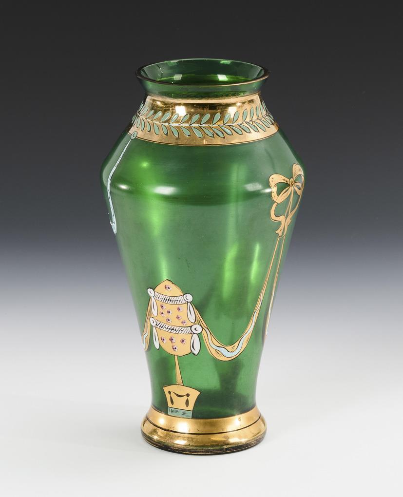 Green satin glass, polychrome enamel painting, gold staffage. H 27,5 cm.