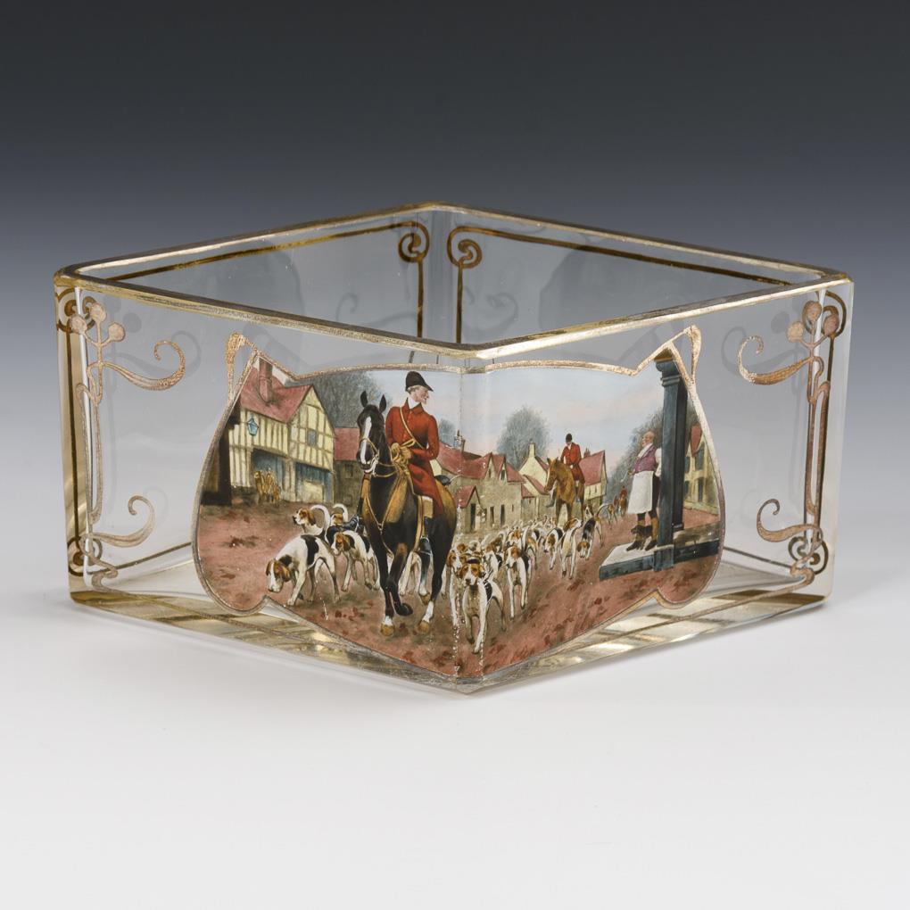 Colorless glass, polychrome enamel painting, silver staffage. H 8,5 cm, L ca. 19,5 cm.