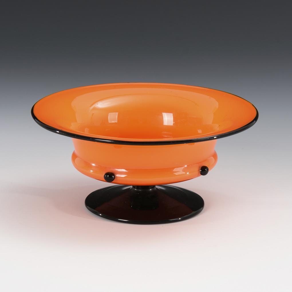 Colorless glass with opal orange inner rim, opaque black foot, applied drops and rim thread, clear glass overlay. H 7 cm.
