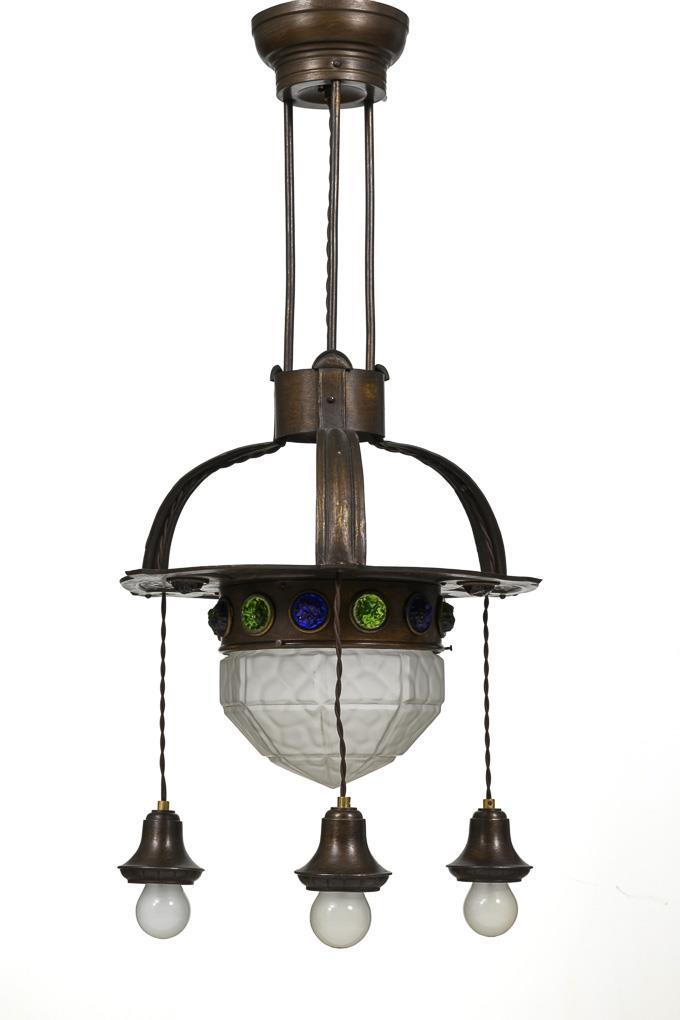 4-flame hanging lamp on 3 ring-framed central struts with bell-shaped canopy and projecting brass frame with polychrome glass inserts and glass bowl made of satin pressed glass with notch decoration, on it 3 hanging bell sockets. Slight signs of age/use, glass rim with small chips.