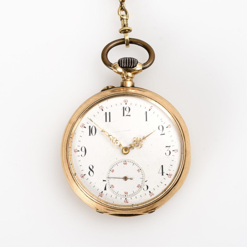 585 hallmarked, Swiss hallmark, fineness stamp, company mark, metal dust cover. Clock Ø 5 cm, 95 g. Chain L 37 cm, 16 g.