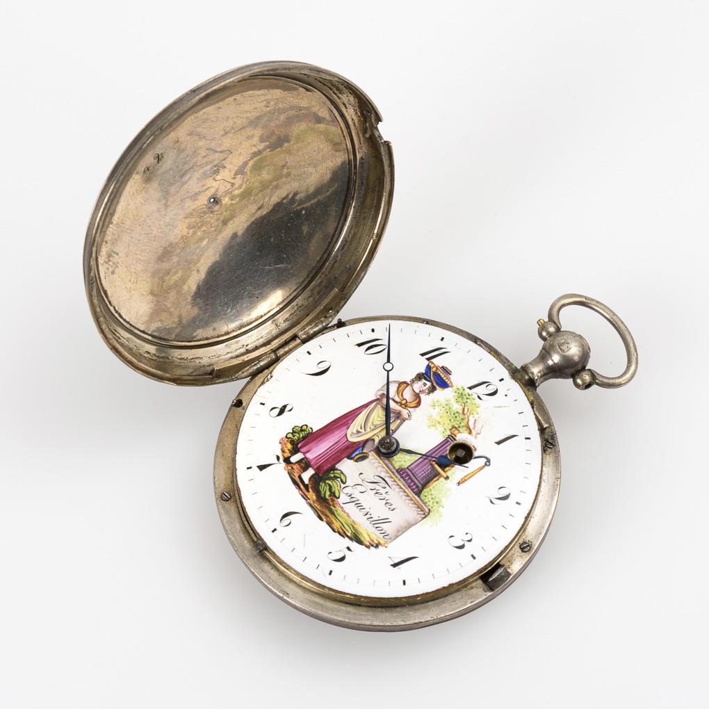 Silver spindle pocket watch with colored painted dial. LES FRÈRES ESQUIVILLON.