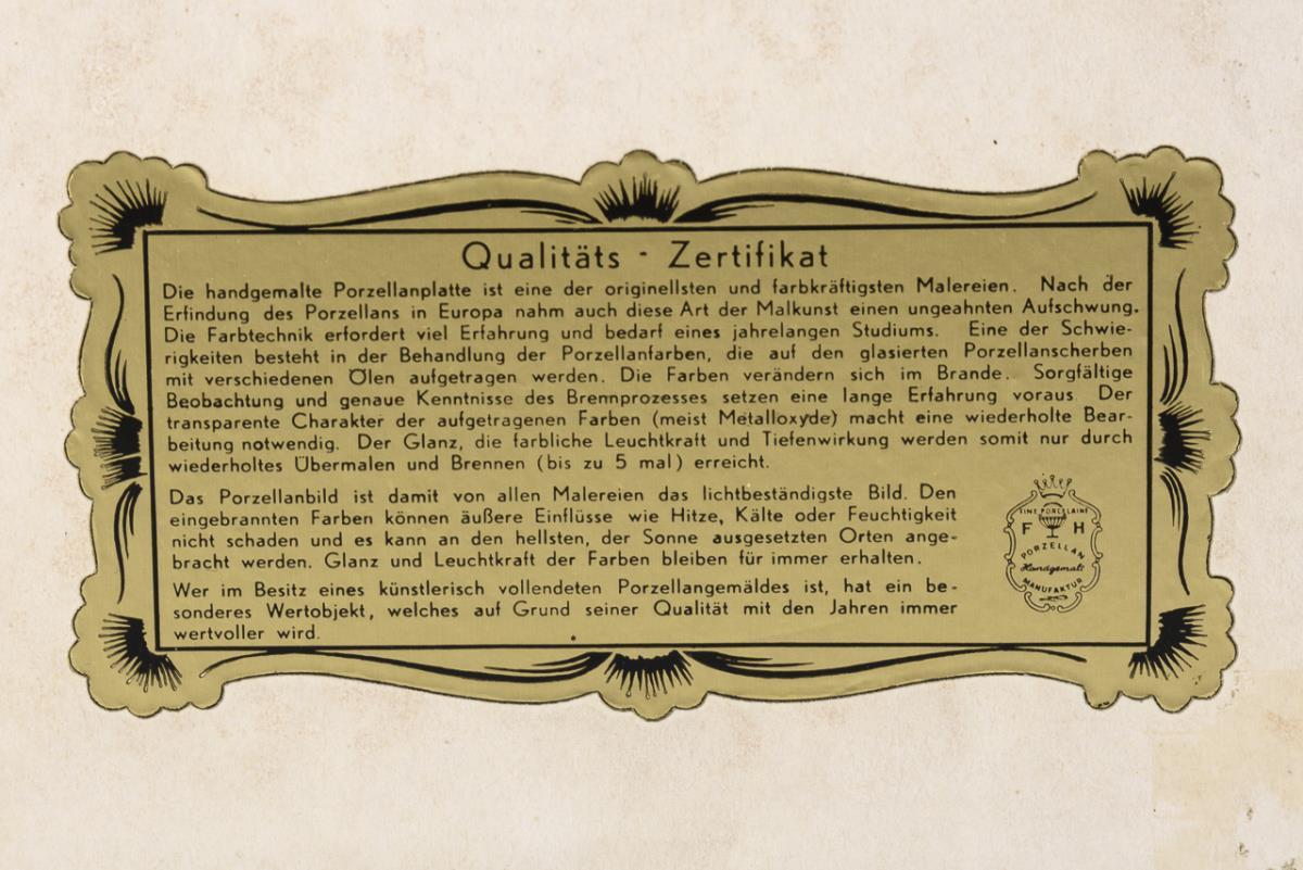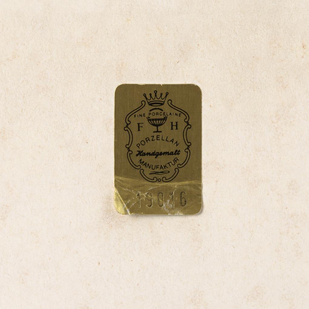 Label "Fine Porcelain FH Porzellan Manufaktur", 2nd H. 20th c. Signed "E. Hüber".