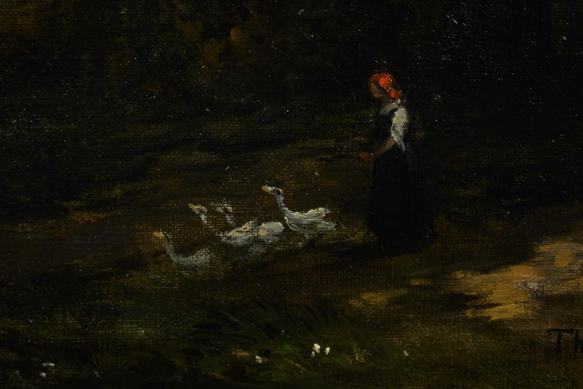 The maid with the geese near the farmhouse cottage in the sunshine at the edge of the forest. Canvas doubled.