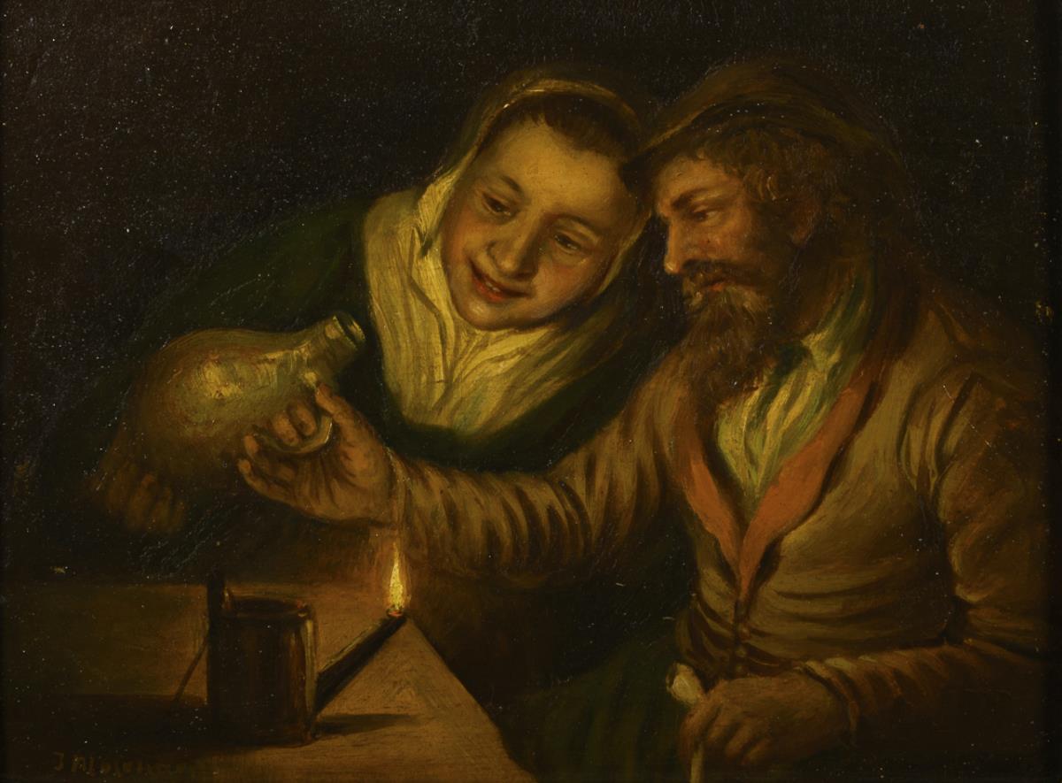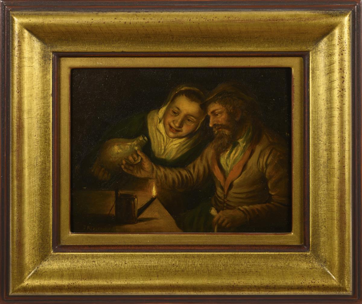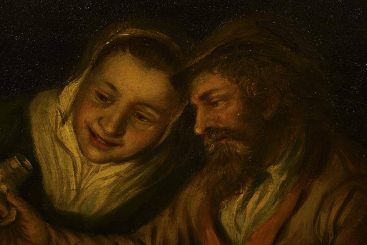 The couple with bottle and pipe in the lamplight.