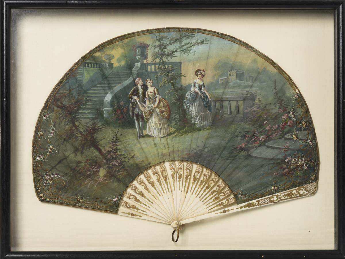 Large painted fan in frame.