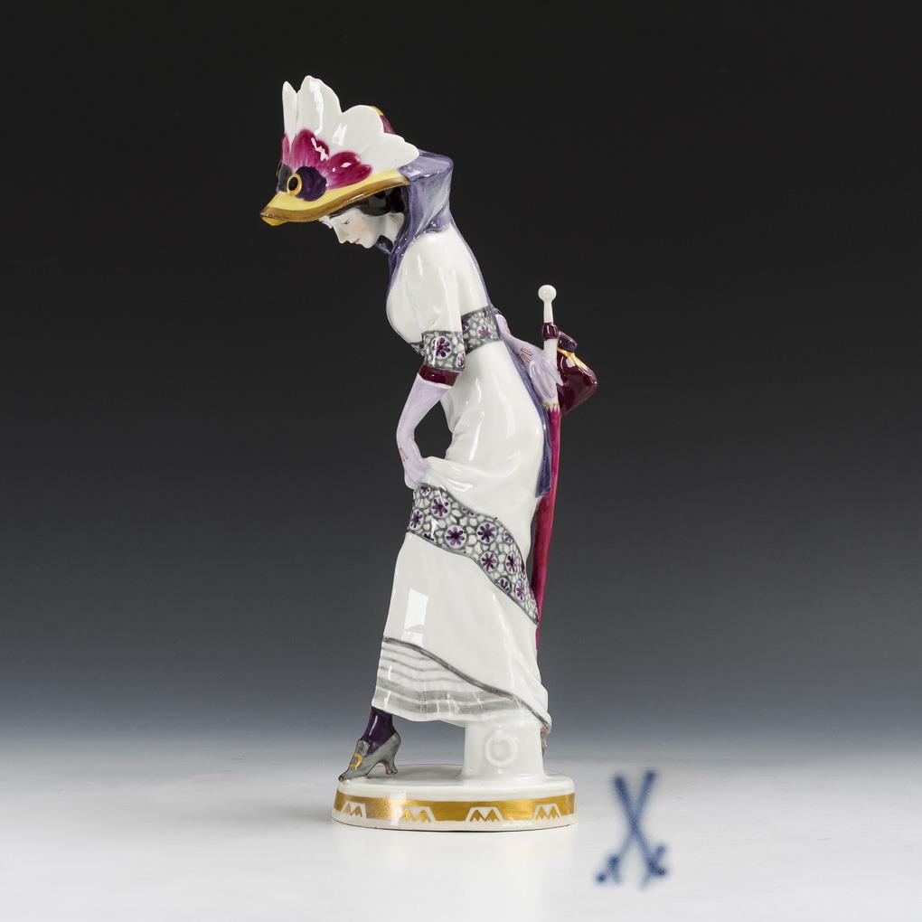 Elegant lady with umbrella and large hat. Embrella knob and bag restored, restoration on the base rim and hat.
