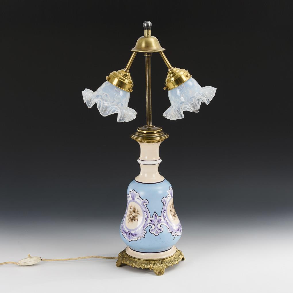 Vase-shaped body with blue base, purple rocaille cartouches with shaded flowers in sepia, top stem with 2 struts for the two 1-flame screw sockets, lampshades with pinched edge. Functional. 2 missing parts and few chips on the edge of the glass.