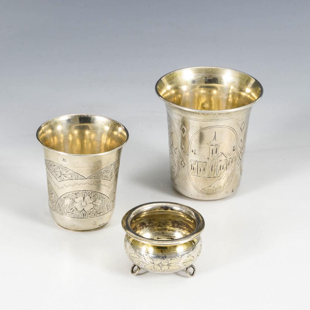 Finely engraved cup and round salt bowl. Slight signs of use.