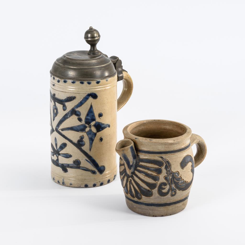 Graues, salzglasiertes Steinzeug mit floralem Ritzdekor und kobaltblauer Bemalung.H 25,5 cm und 12,5 cm.