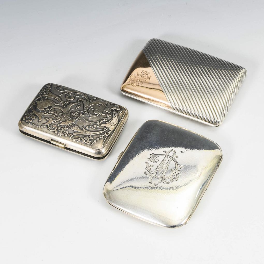 Ribbed, partially gold-plated case (Vienna, 900 silver) with monogram engraving "HB", 1 x 9.5 x 6.5 cm. / Smooth, hand-chased case (indistinctly hallmarked) with monogram engraving "CW", 1 x 9 x 8 cm. / Reliefed case with vines and mythical creatures, 1.5 x 8 x 5.5 cm. Partly slight signs of use.