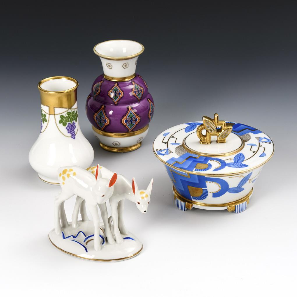 1x vase with purple partial background and polychrome geometric painting (h 13,5 cm). / 1x vase with wine decoration (h 12,5 cm). / 1x box with floral knob and blue-gold stylized floral decor (h 10,5 cm). / 1x pair of fawns (h 11 cm). Partially minimal gold abrasion.