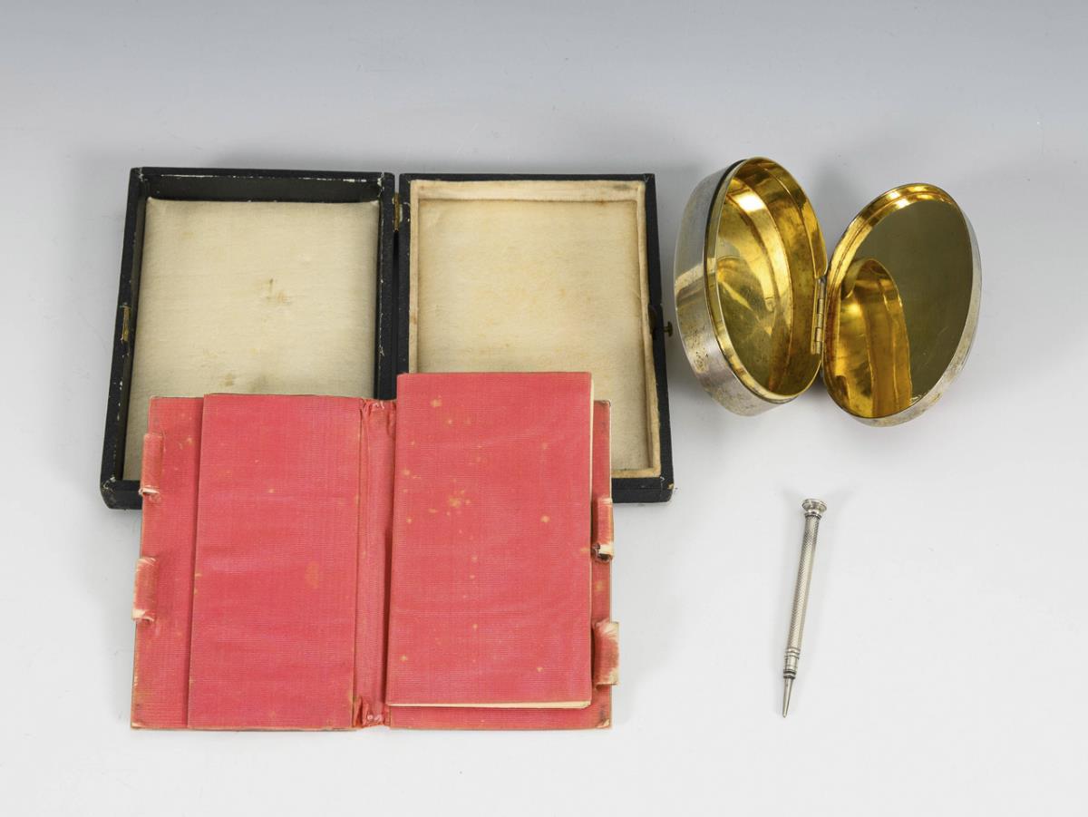 Gilt silver box with monogram engraving "OS" and large oval cabochon on the lid (4 x 8,5 x 5 cm). / Elegant notebook with mother-of-pearl cover and openwork silver overlay (1 x 9.5 x 6.4 cm), in black box. Signs of age. Amber with edge chip.