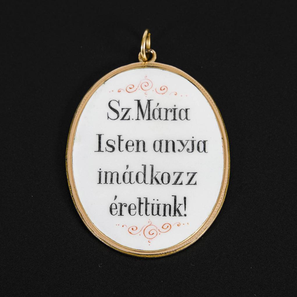 Enameled Mother of God motif with Hungarian prayer saying on reverse. "Holy Mary Mother of God, pray for us!".