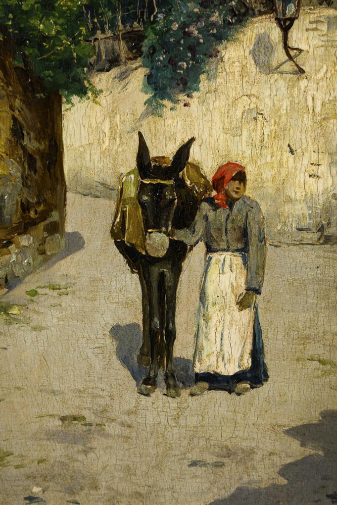 Woman with donkey in the bright sunshine on the street in the Mediterranean city. Slight signs of age.