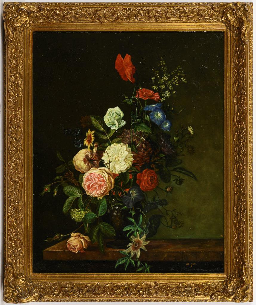 Beautiful bouquet in the style of the 17th century with various flowering plants in small vase on a ledge against a dark background. Slight signs of age.