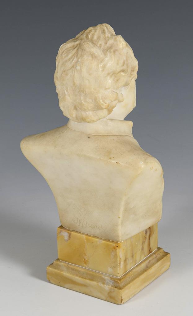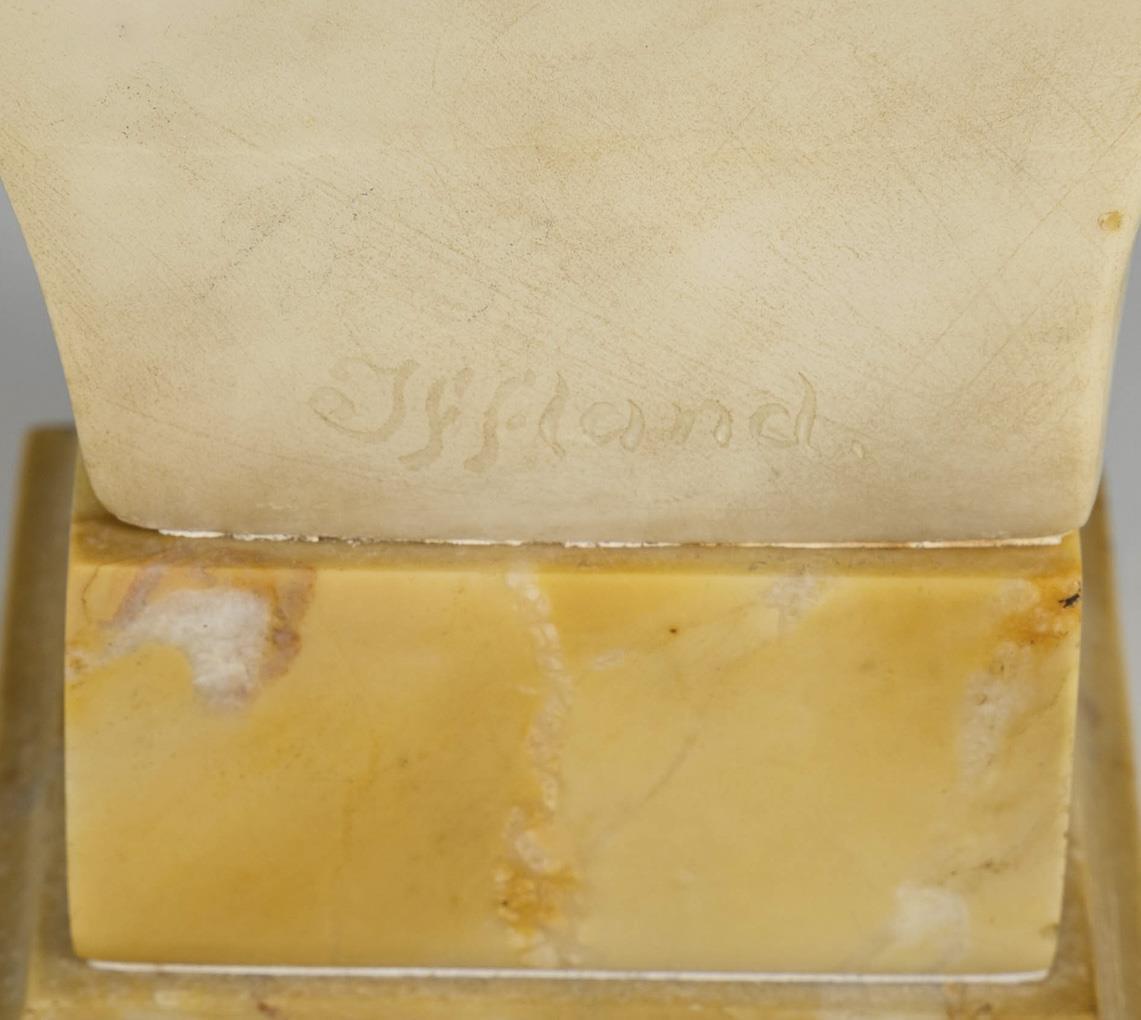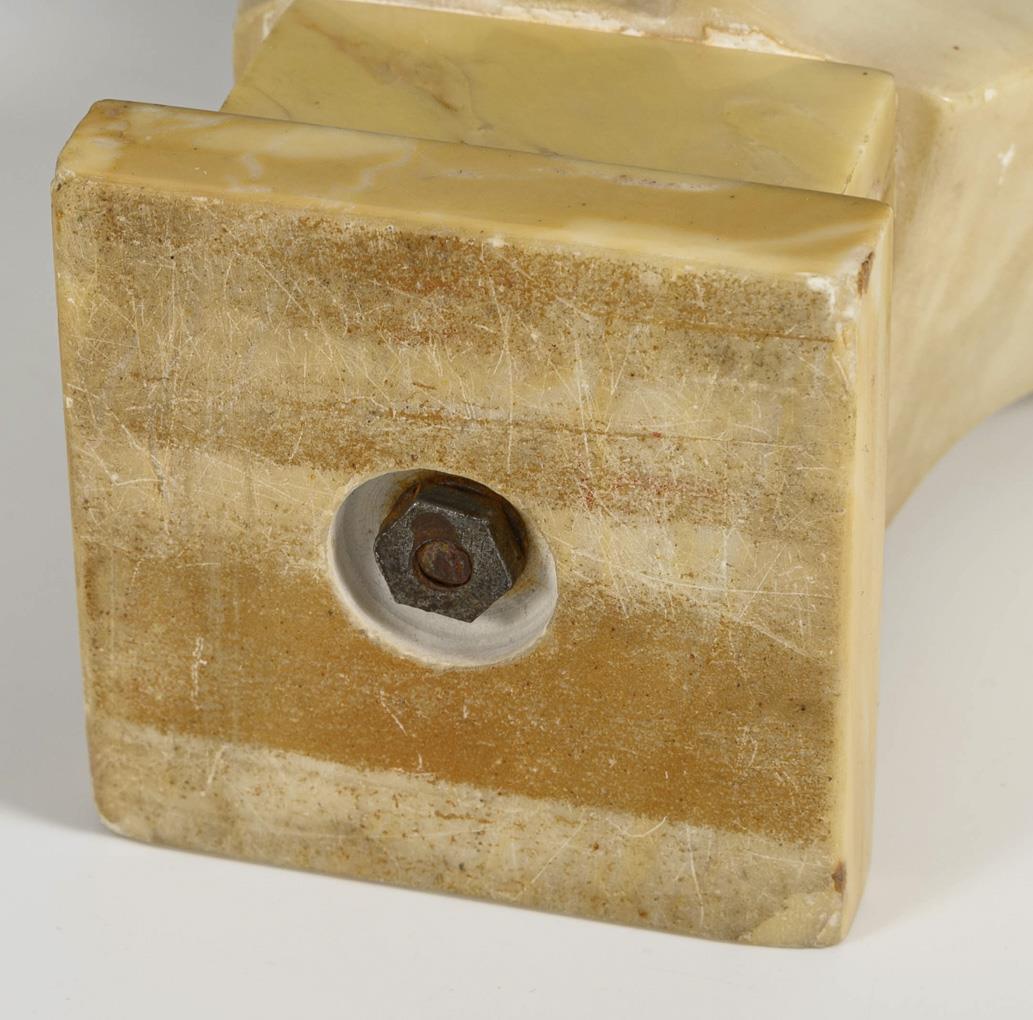 Alabaster, ocher marble base. Inscribed. H 16,5 / 21,5 cm.