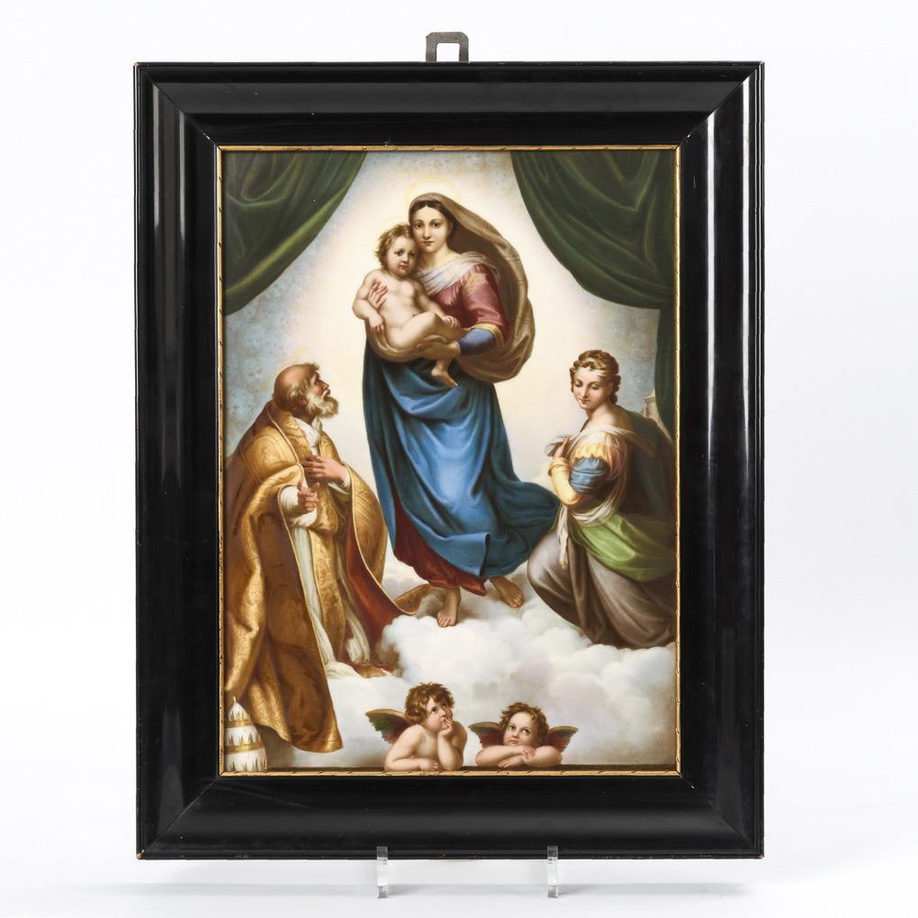 Rectangular picture plate depicting the Madonna with Child and Saints, after the famous painting by Raphael (1483-1520) in the Old Masters Picture Gallery Dresden.