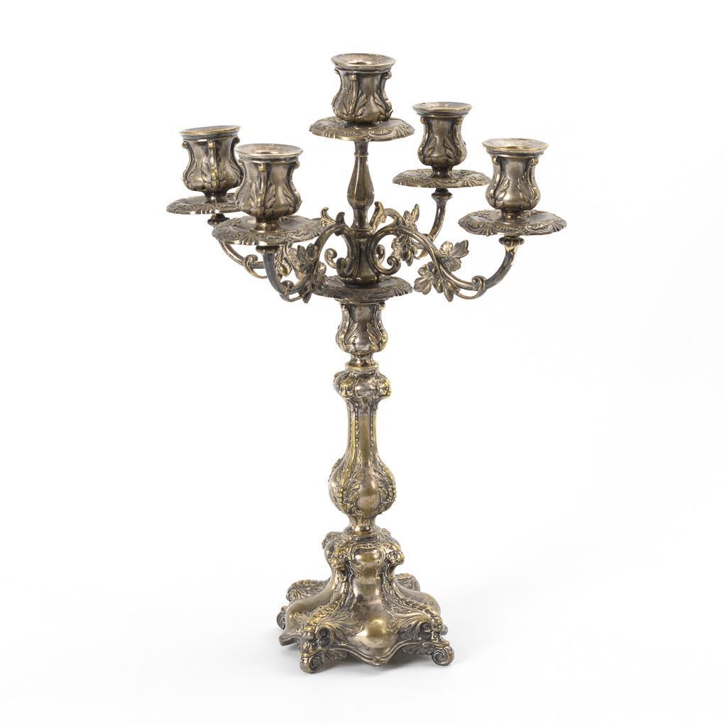 Magnificent candlestick with stylized dolphins on the godroned foot, lion masks on the baluster shaft, 4 leaf-studded arms as well as raised central spout. Silver plating rubbed.
