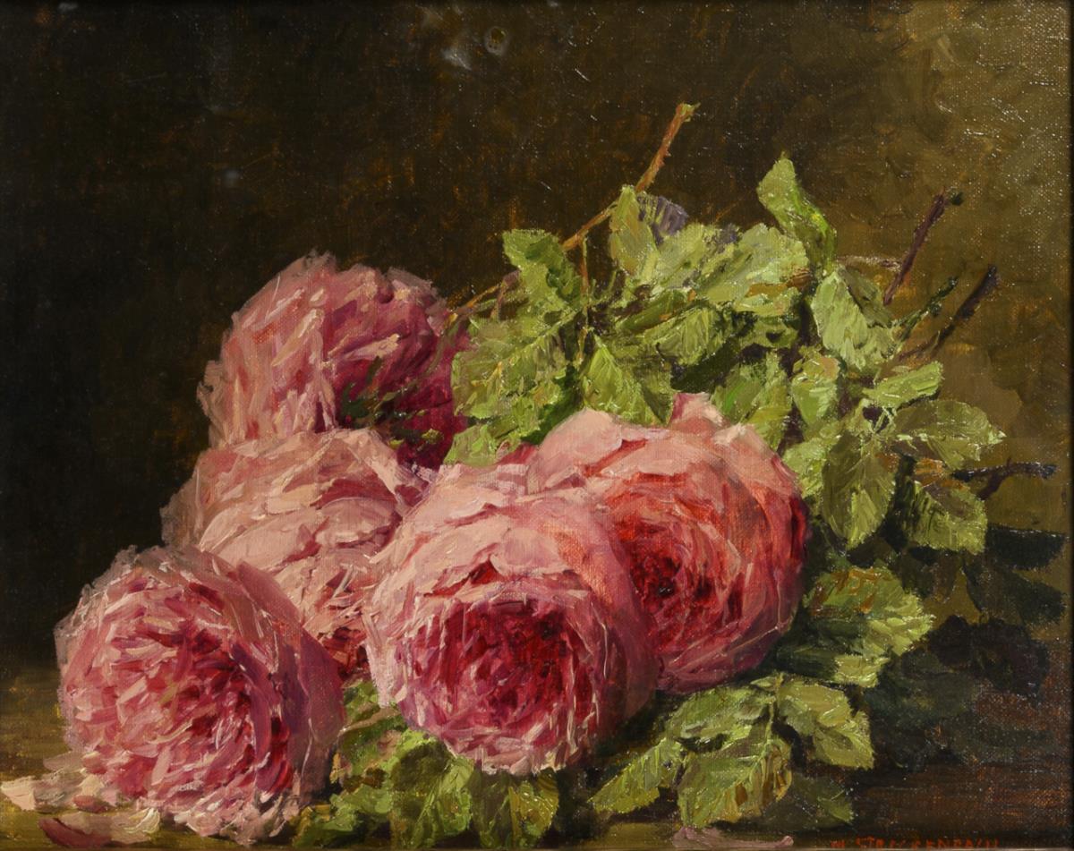 Reclining bouquet of roses with pink flowers. Traces of age.