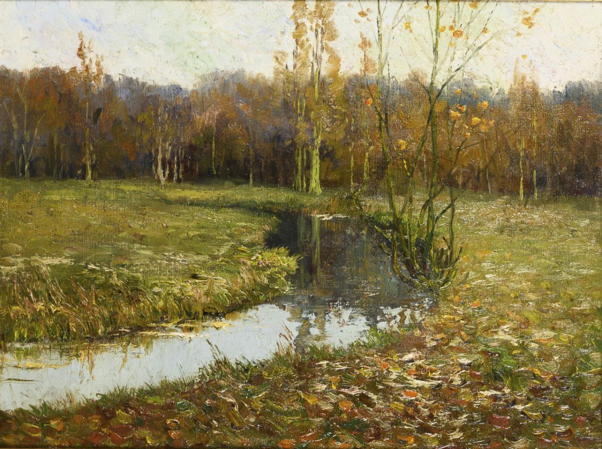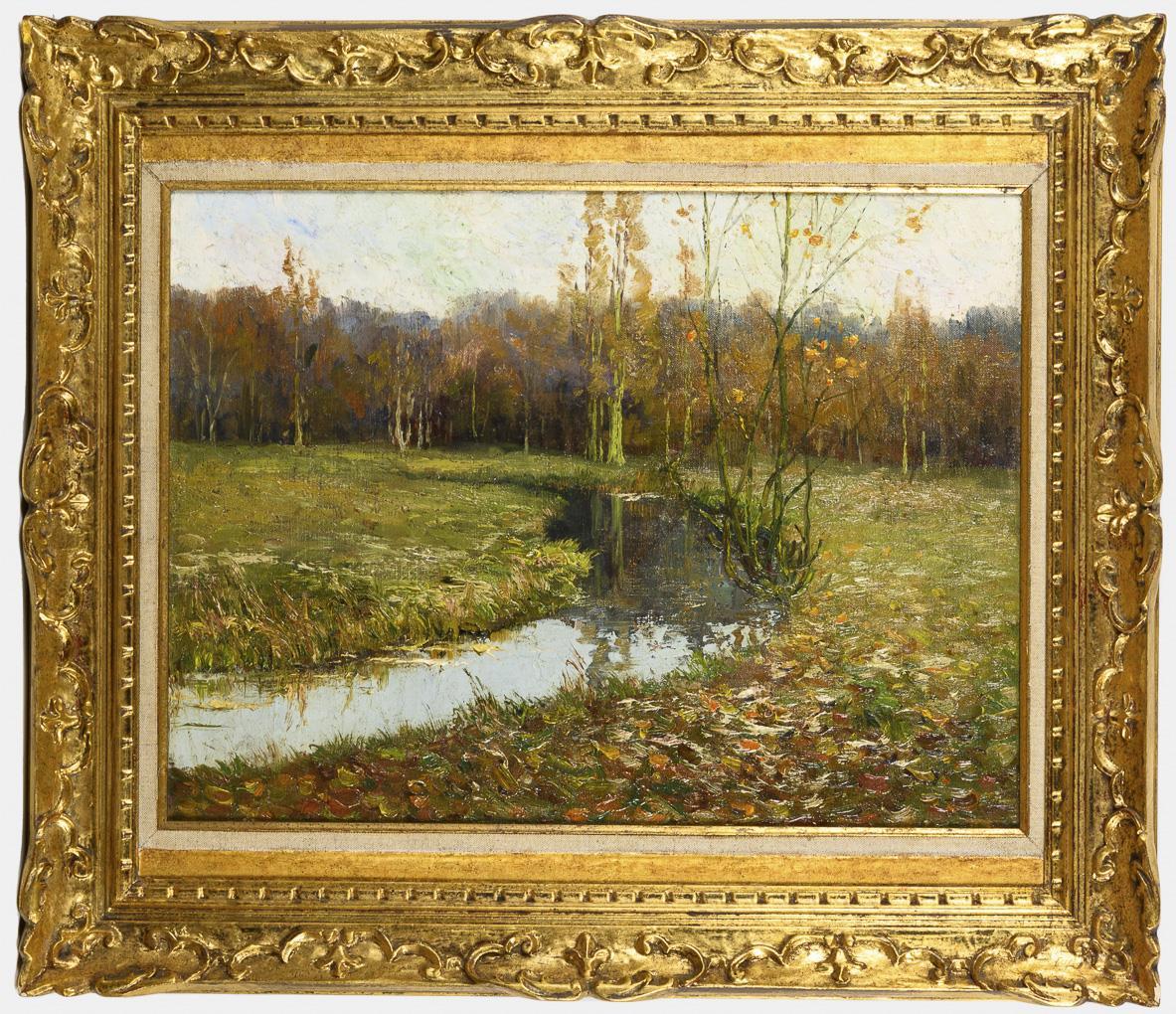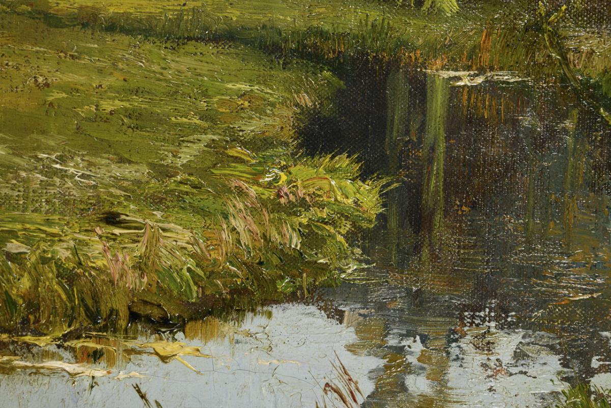 Leisurely flowing water in a meadow near the edge of the forest. A small restored spot with backing.