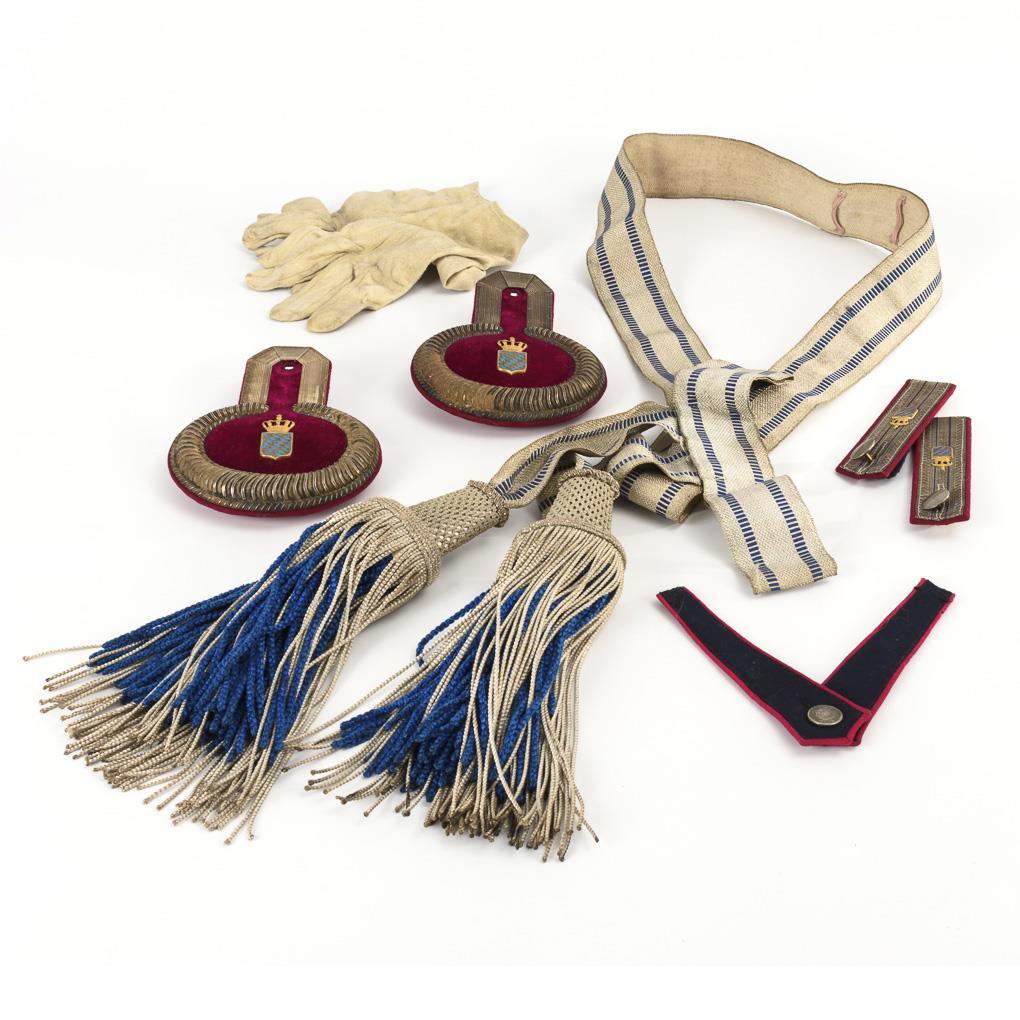 Bandolier of silver braid with blue interweaving and 2 corresponding tassels. 2 epaulettes and 2 shoulder pieces with crests. 2 cloth tabs. 2 gloves. Partly signs of age / use.