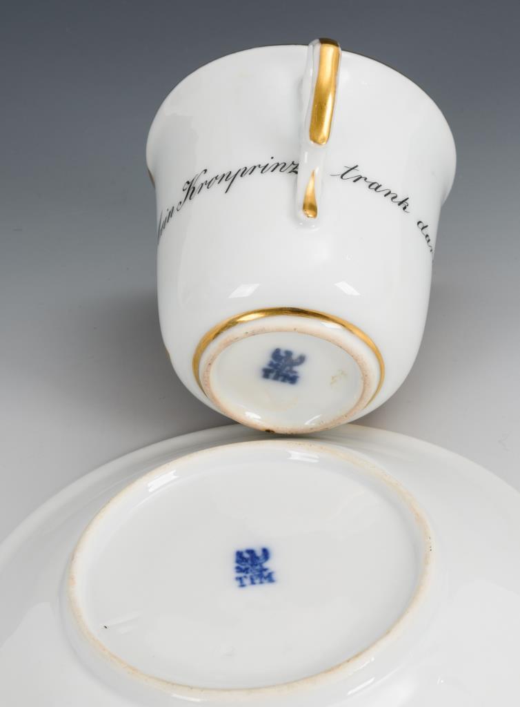 Konische Tasse. Schauseitig eine Rechteckkartusche mit der sepiagemalten, bezeichneten Ansicht des Marktplatzes in Goslar am Harz, verso die Aufschrift "Mein Kronprinz trank daraus".