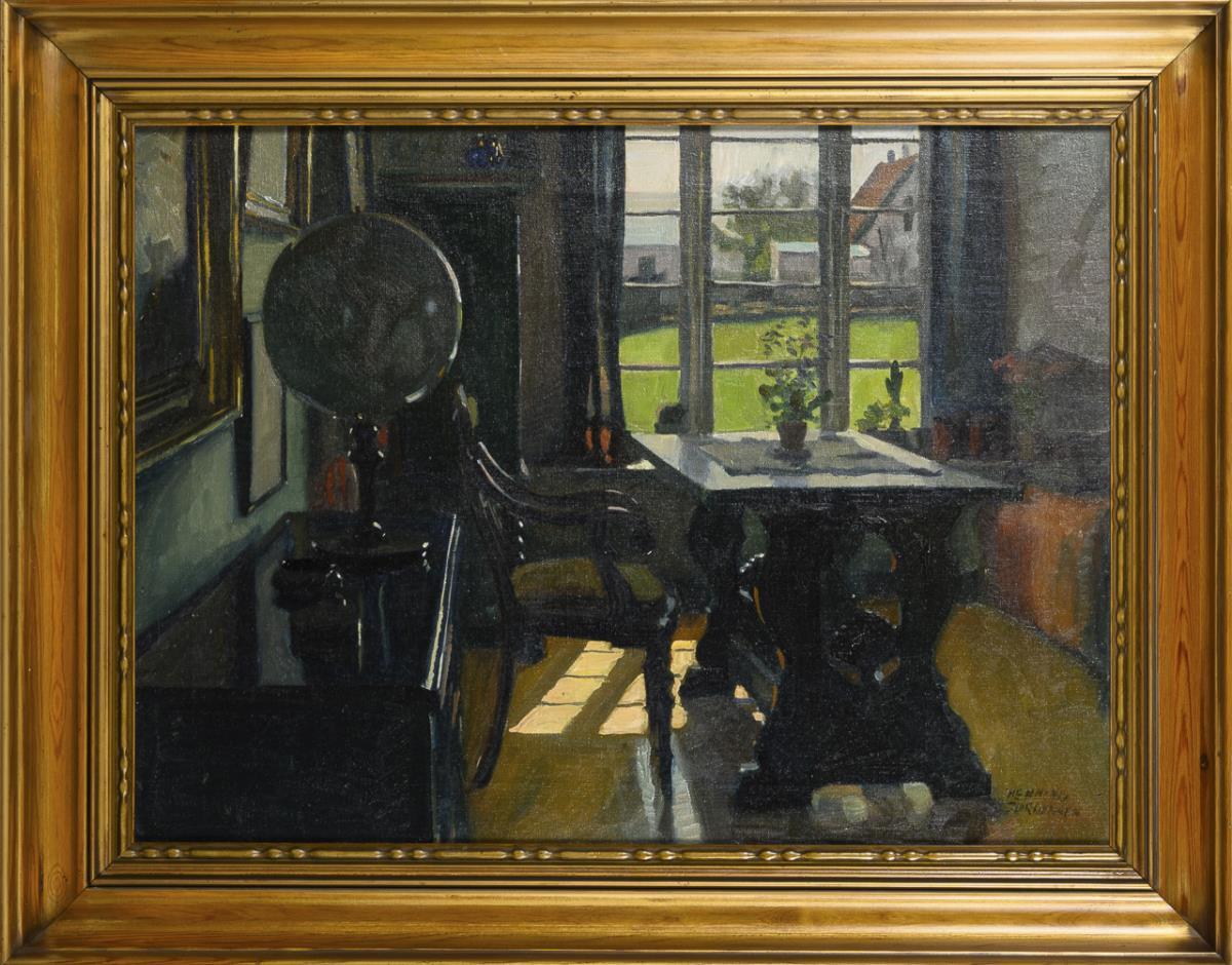 Globe on dresser in front of a wall with paintings, in front of a table with chair and penetrating sunlight through the window. Minimal signs of age.