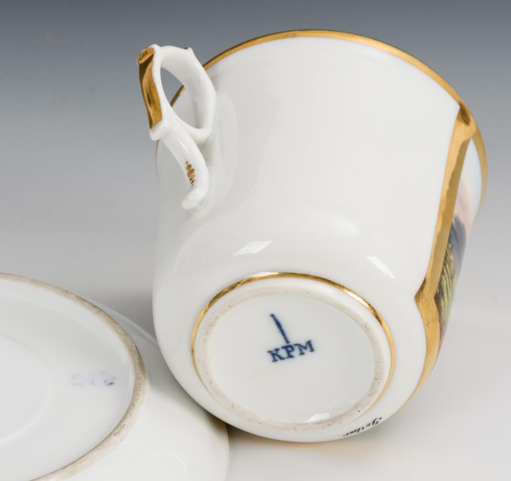 Polychrome Malerei, Goldstaffage.H Tasse 10 cm, Ø ergänzte Untertasse 17,5 cm.