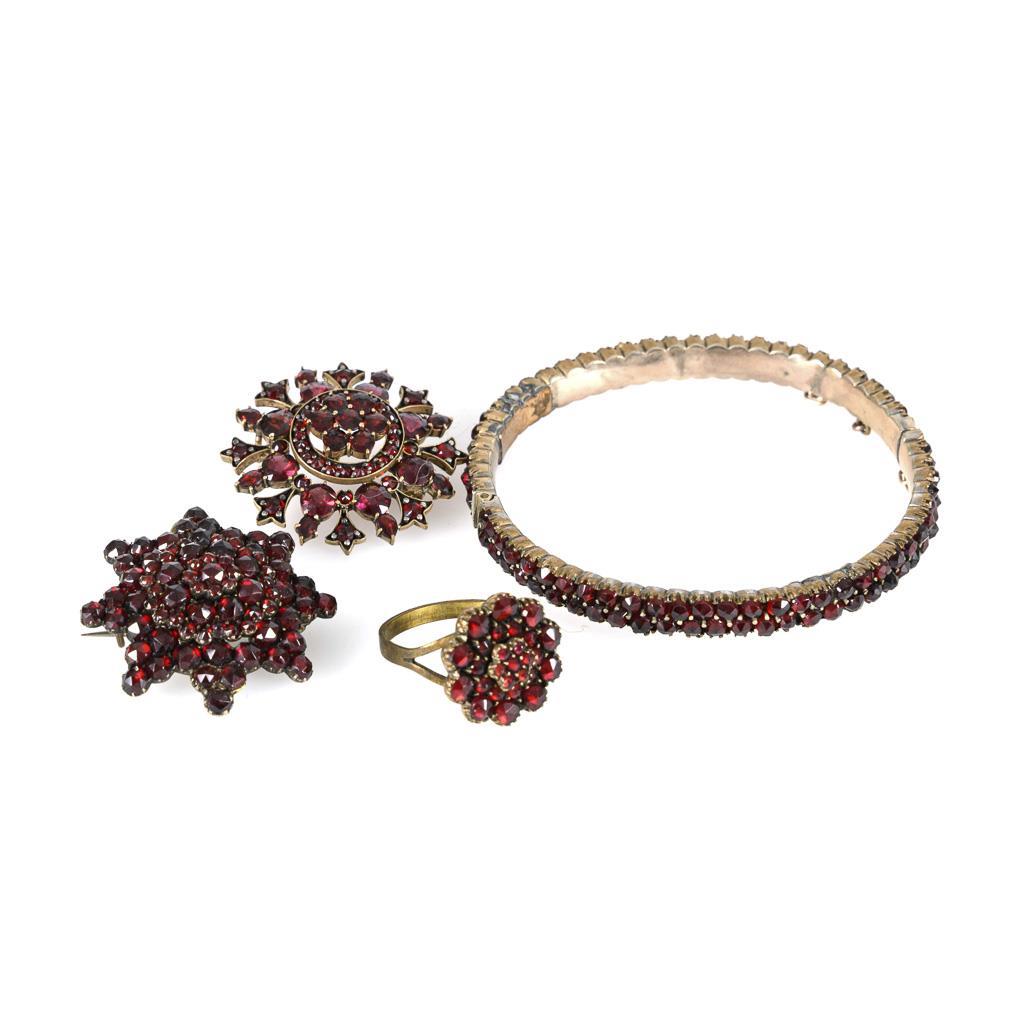 Folding hoop, 2 brooches and ring with garnet trim. Box lock with safety chain. Hook clasps. Narrow rail. Mature with 2 repair spots and small dents inside.