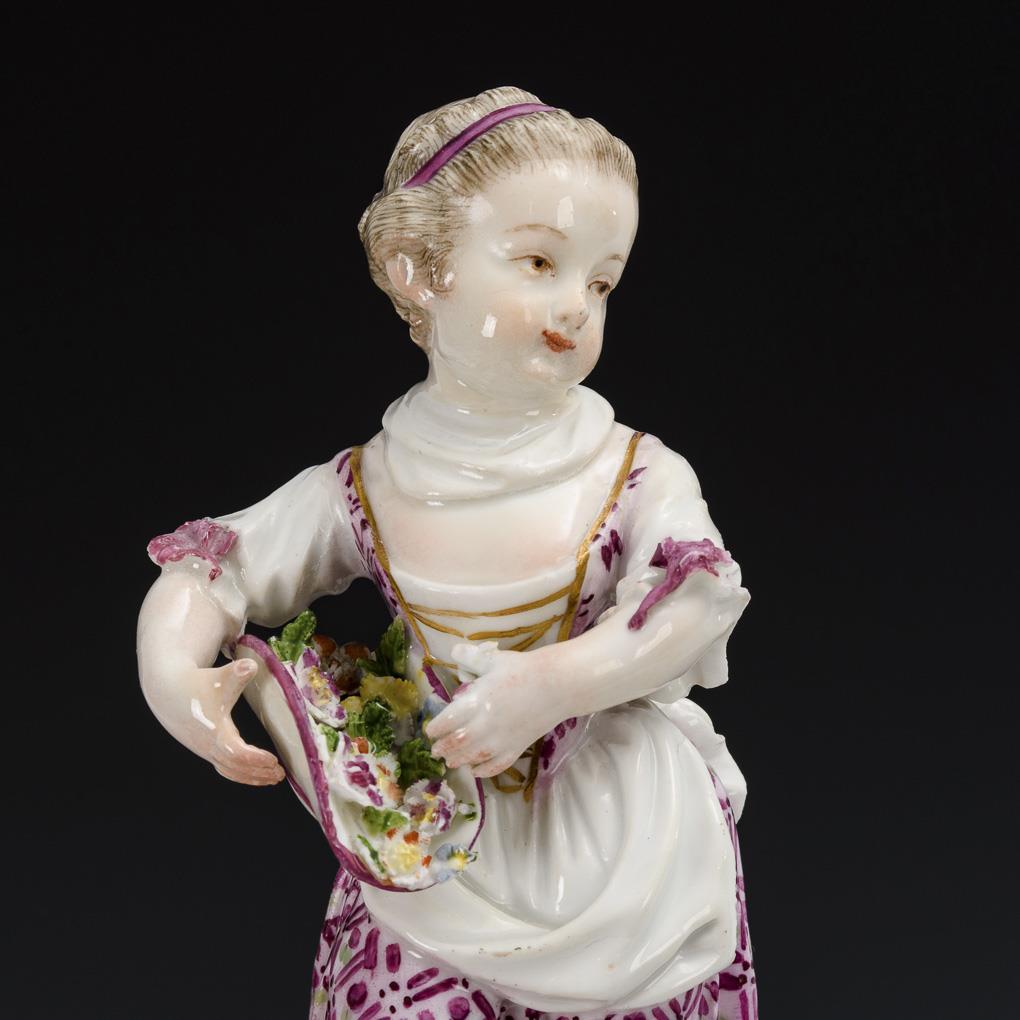 Girl standing on a rocaille base with flower-filled hat. Partial gold abrasion, bumps on the flowers, bows and sleeve ruffles, neck restored.
