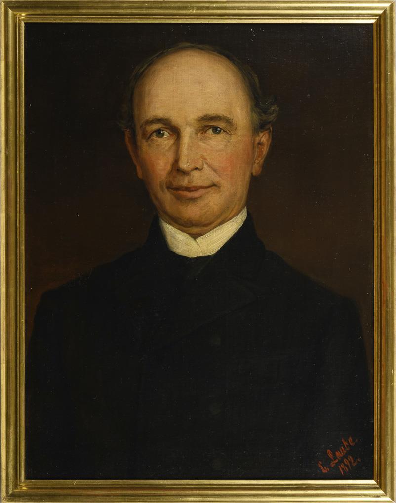 Portrait of an elderly man in black suit with white collar against neutral background.