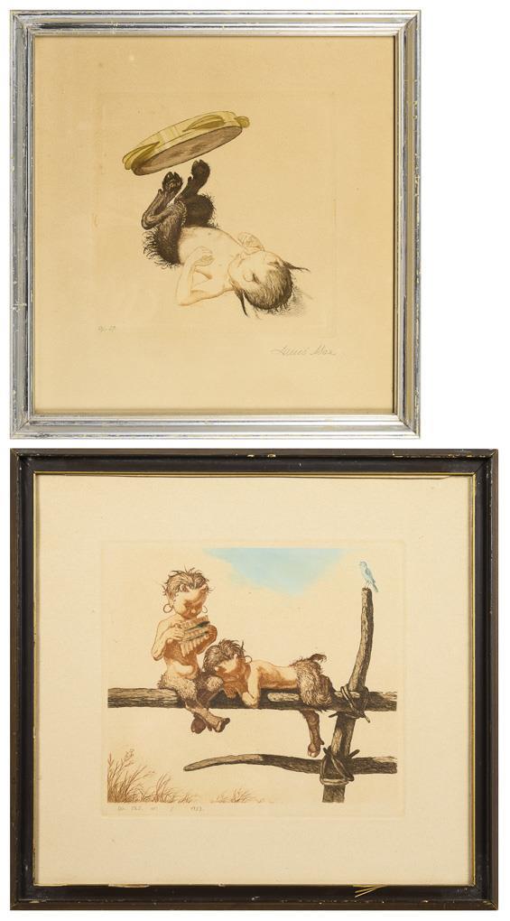 Faun with Tambourine, pencil signature, inscribed "Op. 29", plate: 19 x 19 cm, framed & behind glass: 34.5 x 33 cm, sheet browned and foxed | Sleeping Faun and Faun with Pan Flute, inscribed in the plate "Op. 125 No.", dated "1932" in the plate, plate: 22.5 x 25 cm, framed & behind glass: 38 x 40 cm, sheet browned and creased.