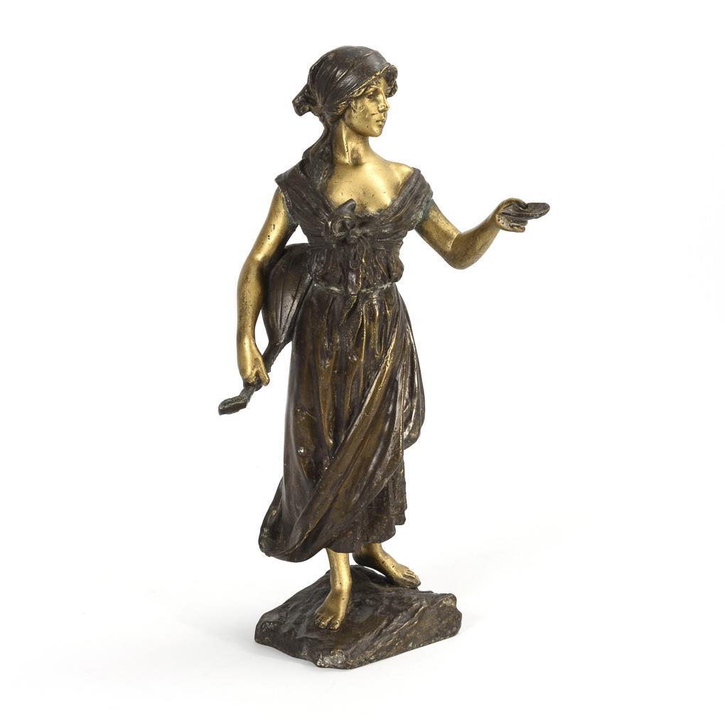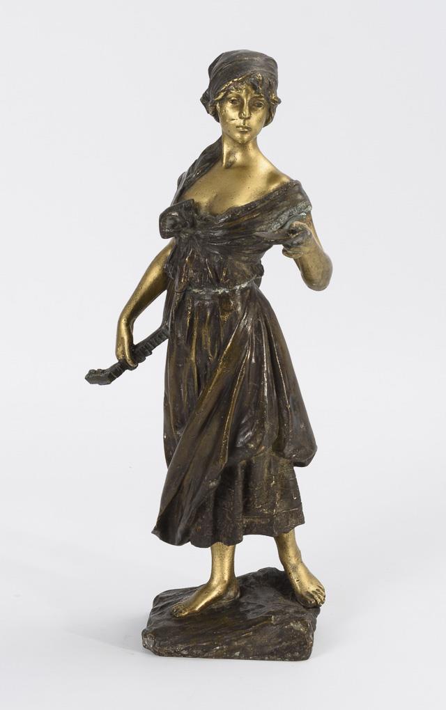 Standing female figure in a low-cut dress, handing a bowl with a lute draped around her probably after playing. Strong signs of age/use, partly open soldered seam on the belly.