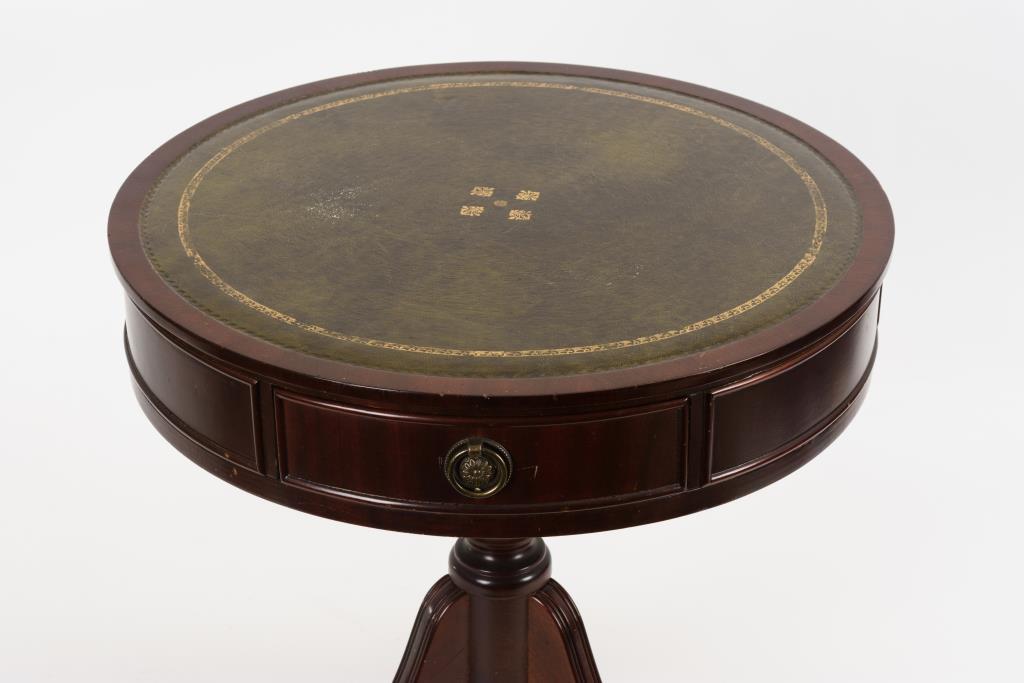 Kleiner runder Beistelltisch auf Mittelstütze mit Säbelbeinen und Tatzenfüßen, Tischplatte verziert mit goldgeprägtem, grünem Lederbezug, glatte Zarge mit 3 kleinen Zargenschüben. Furnier mit Trockenrissen, Alters-/Gebrauchsspuren.