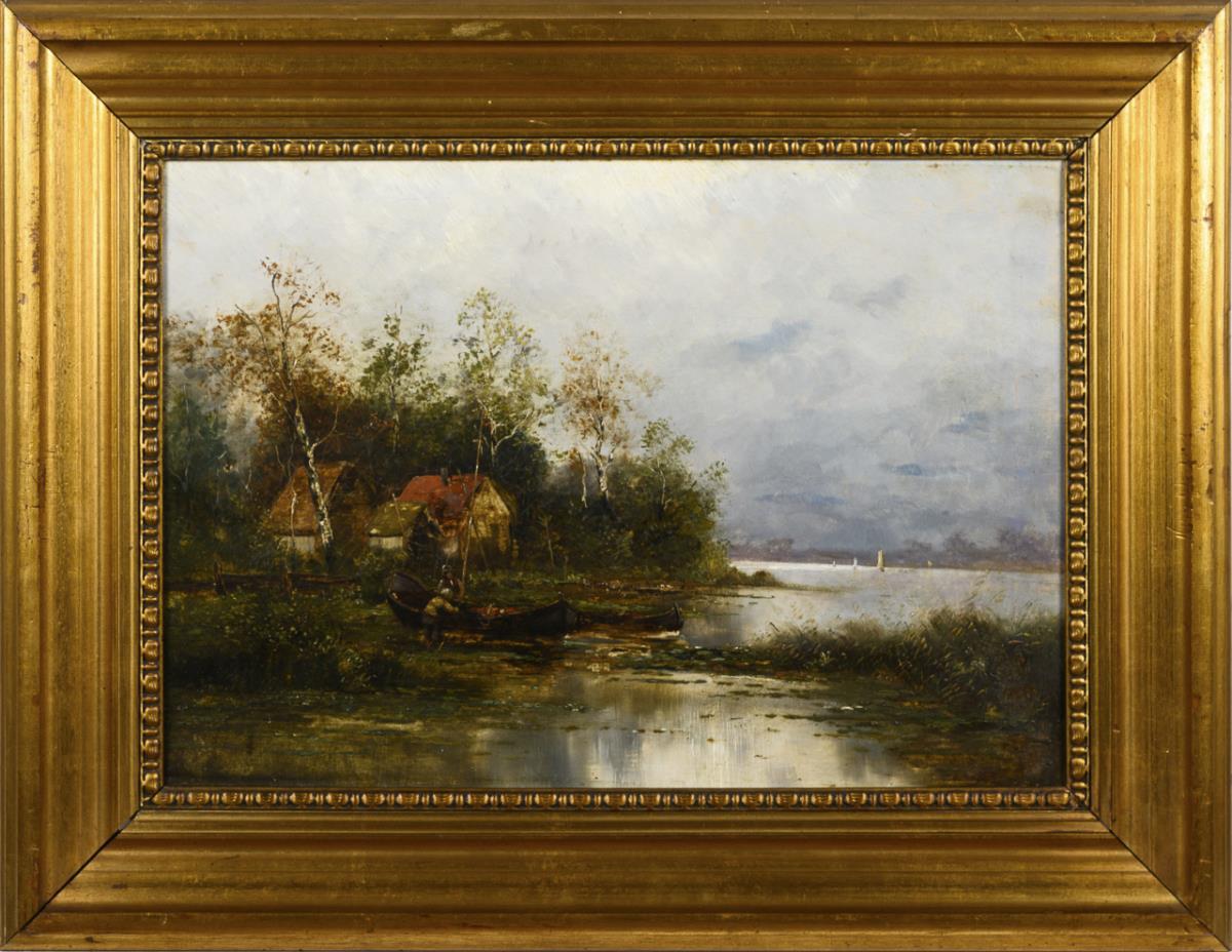 People at the boats near the houses on the shore in front of the forest. A restored place with backing.