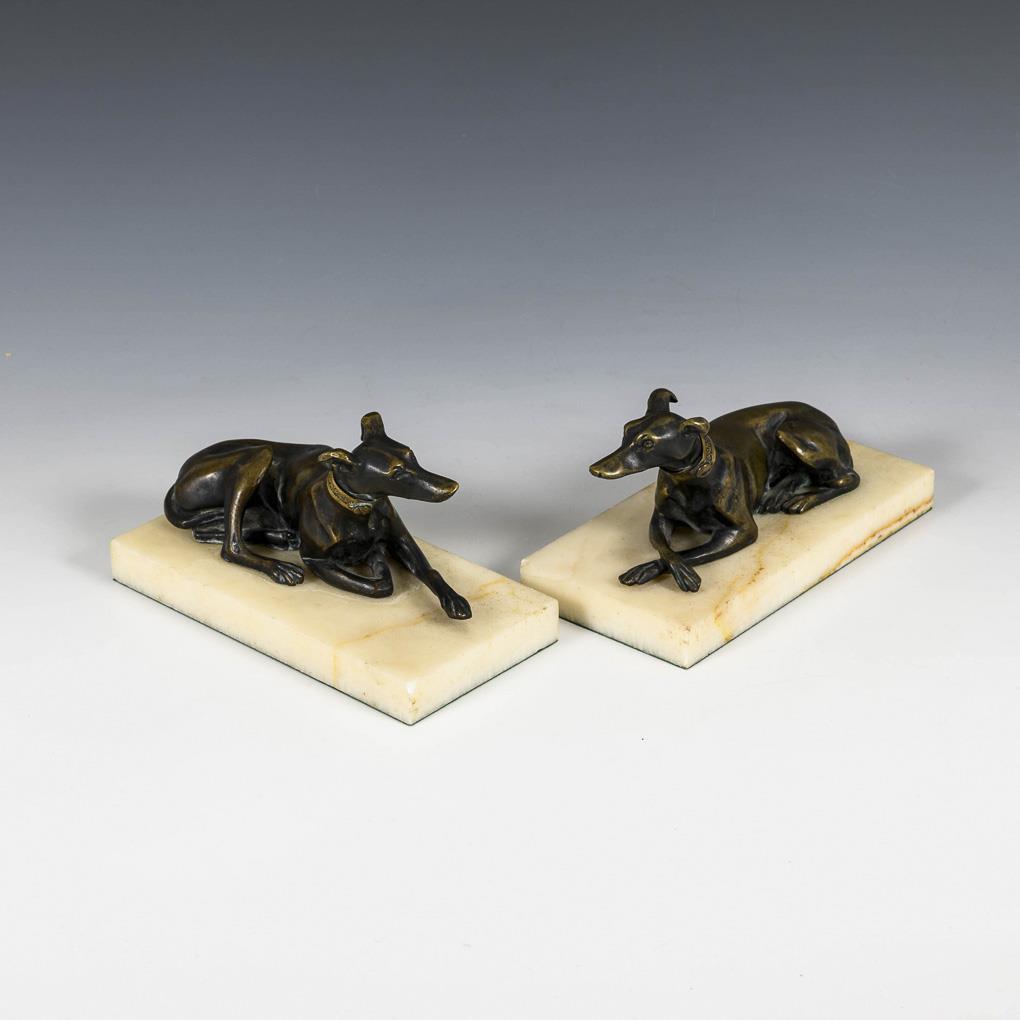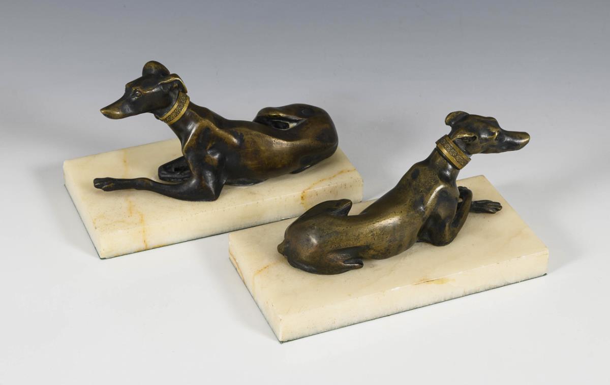 Bronze patinated, mounted brass collars, white marble plinths. H 7 cm, overall 9 x 17 x 8.5 cm.