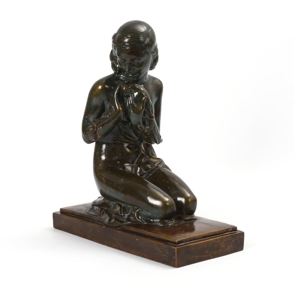 Kneeling nude of a young woman tenderly holding a parrot in her arms. Slight hairline crack in the base, minimal chips, signs of age/use.