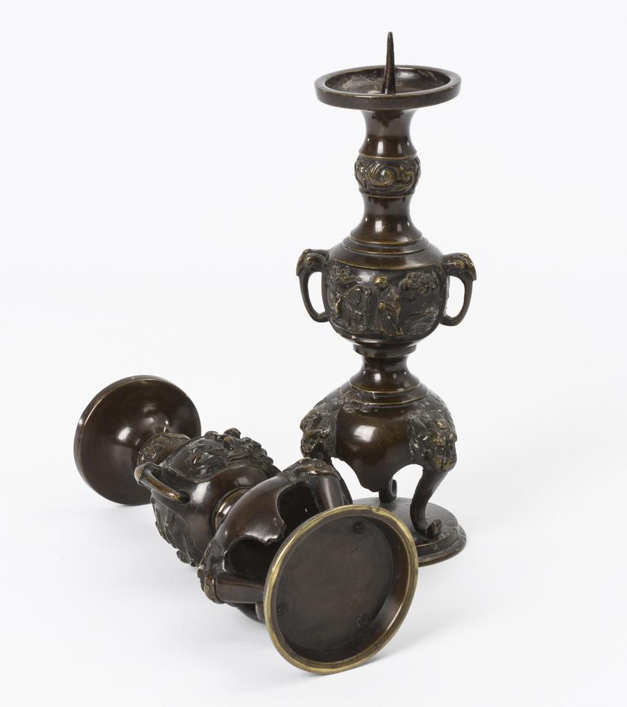 Heavily articulated body with reliefs and handles. On wall: Man decorating a goat and man with bowl. A candlestick slightly slanted.