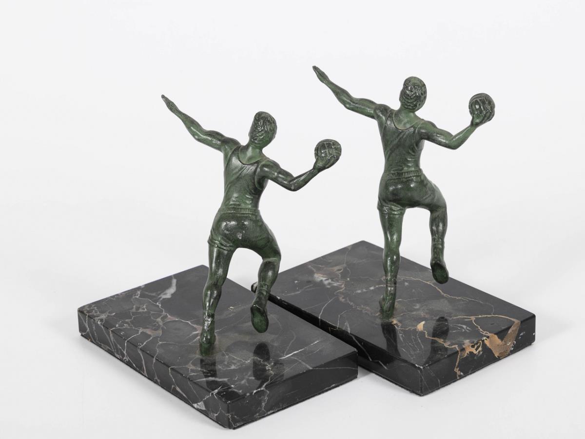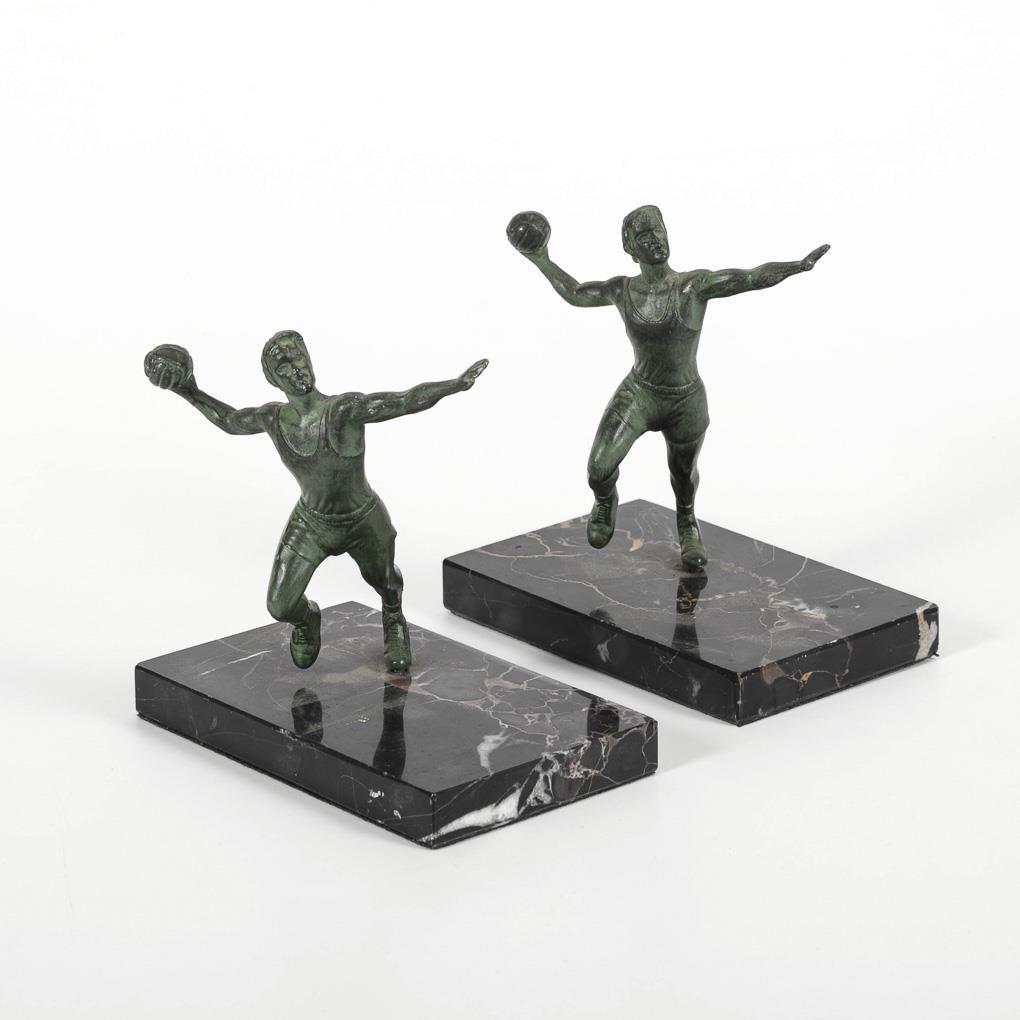 Green patinated cast metal, black marble plinths. H 11 cm, total 13 x 13 x 8 cm.