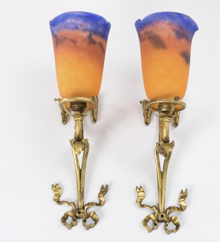 Triple-notched bell shade (L 14,5 cm) at the mouth rim. On curved candelabra arm with foliage and laurel garland and bow decoration.