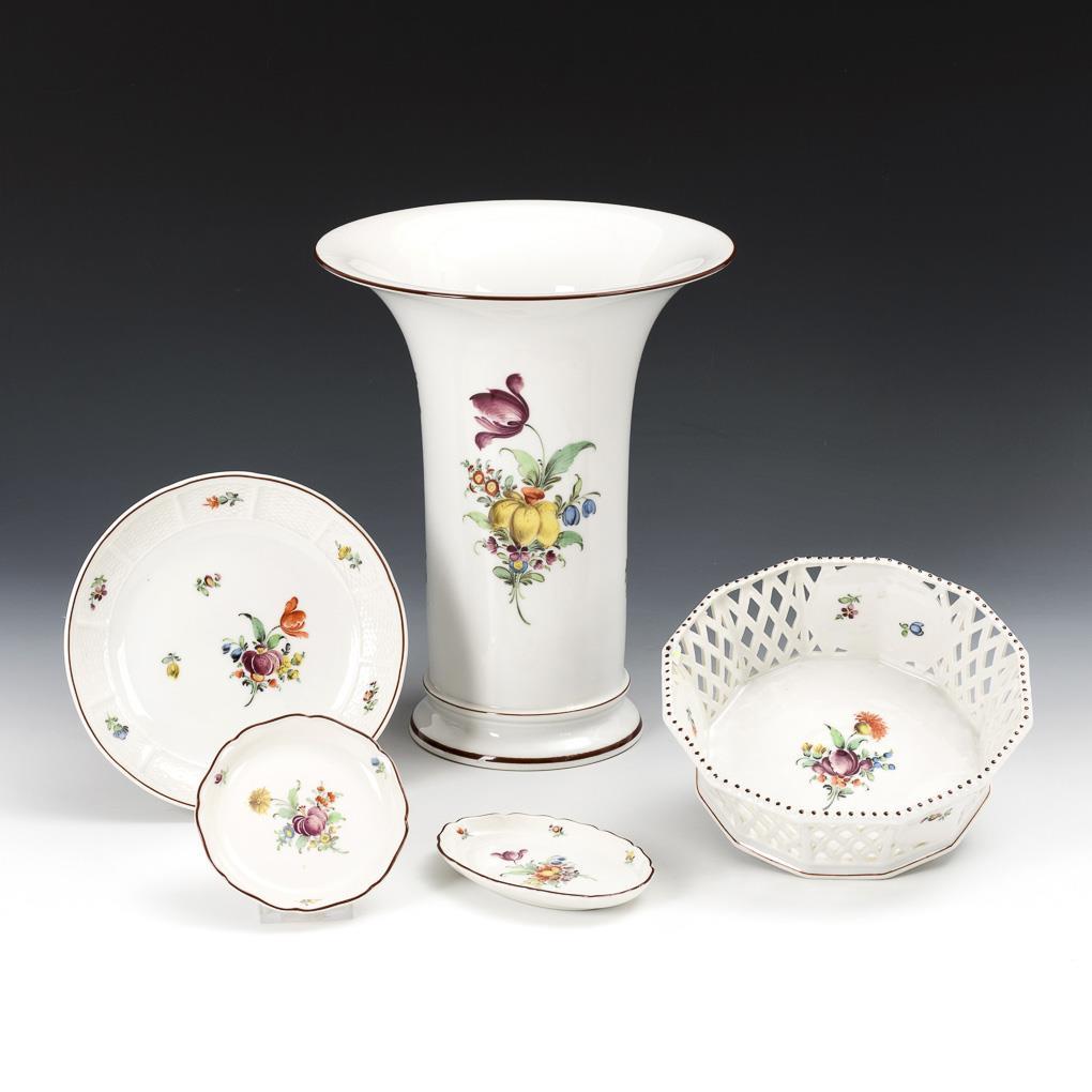 Crat vase (h 25 cm), breakthrough bowl form "Bavarian Royal Service" (Ø 17 cm), plate form "Altozier" (Ø 16 cm) and oval and round small plate (L 11.5 cm and Ø 9.5 cm).