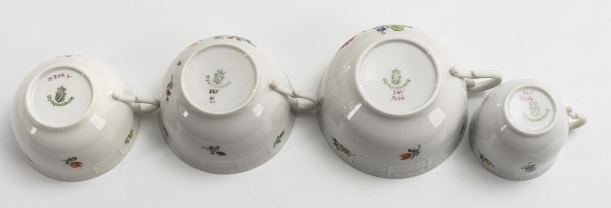 77 parts. Form "Altozier". Coffee pot (H 22,5 cm), creamer, 2 sugar bowls, 6 demitasse cups with 6 saucers, 6 + 6 coffee cups (H 5 and 4,5 cm) with 7 + 6 saucers (Ø 14,5 and 15,5 cm), 6 tea cups with 6 saucers, 8 + 12 plates (Ø 19 and 21 cm), 1 coaster, 1 cheese box, 1 king cake plate (L 30,5 cm) and 1 oval tray (L 21,5 cm).