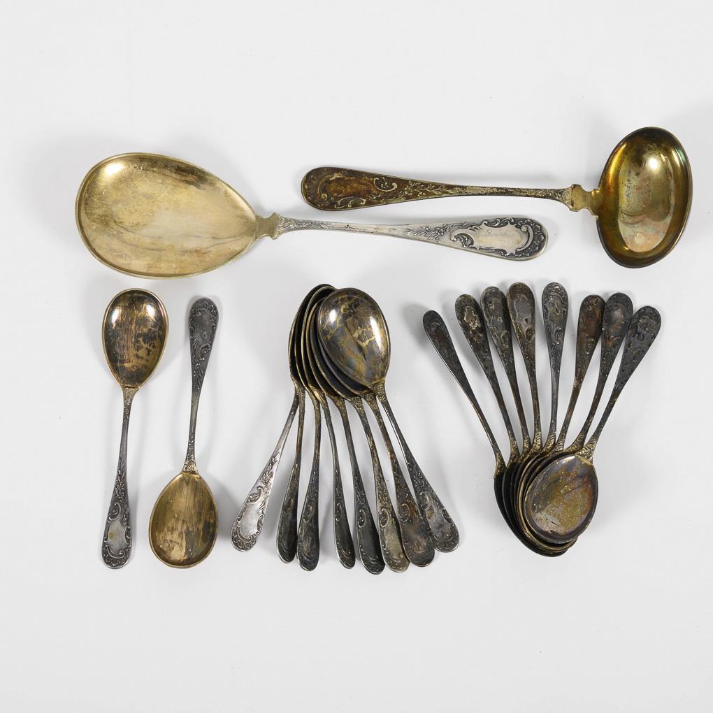18 small spoons, sauce ladle and serving spoon. Age blackened.