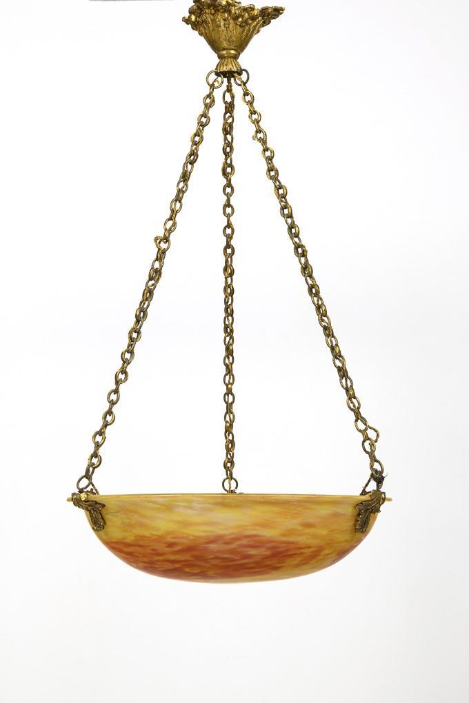 1-flame hanging lamp on 3-fold chain suspension with acanthus leaf socket and floral decorated canopy, glass bowl with orange and yellow powder fusions. Traces of age/use, metal with traces of corrosion.