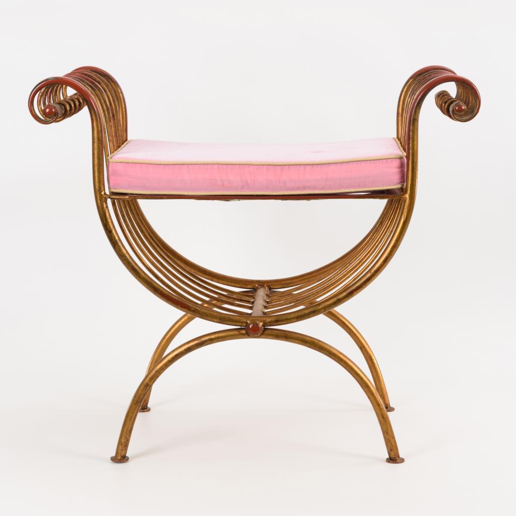 Moderner Scherenhocker aus bronziertem Messing in antikisierender Form, mit rosafarbenem Sitzkissen. Vergoldung berieben.